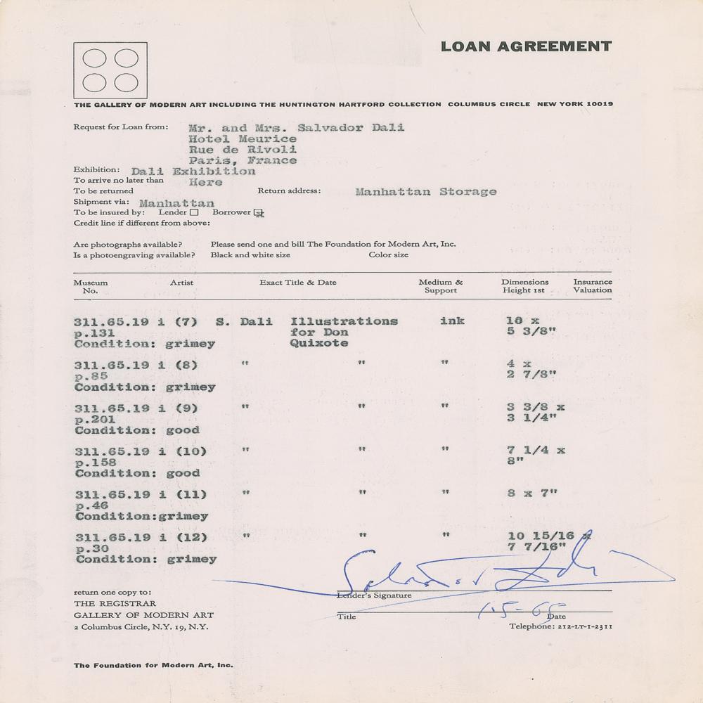 DS, one page, 8.5 x 11, January 5, 1965. Museum of Modern Art loan agreement for six of Dali's original "Illustrations for Don Quixote." In fine condition, with staple holes in the upper left corner. A highly desirable document boasting Dali's scarce full signature.