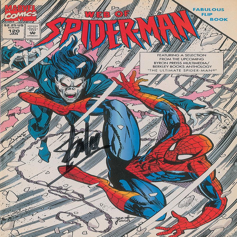 Issue No. 120 for the Marvel Comics comic book Web of Spider-Man, 6.75 x 10, with front cover depicting Spider-Man and Morbius, the Living Vampire, signed in black felt tip by Stan Lee. In fine condition.