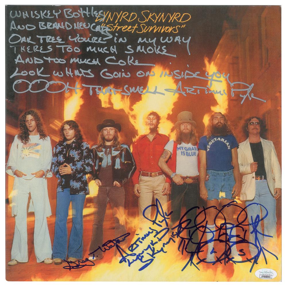 'Street Survivors' album by Lynyrd Skynyrd, signed on the front cover in blue felt tip by Greg T. Walker, and twice by Artimus Pyle: once in silver ink with lyrics to the song 'That Smell,' and then again in blue felt tip with drum sketch and "Lynyrd Skynyrd." Pyle signs a third time on the inner gatefold. In fine condition, with a JSA label affixed to lower front cover. Both the record and the JSA certificate are not included.