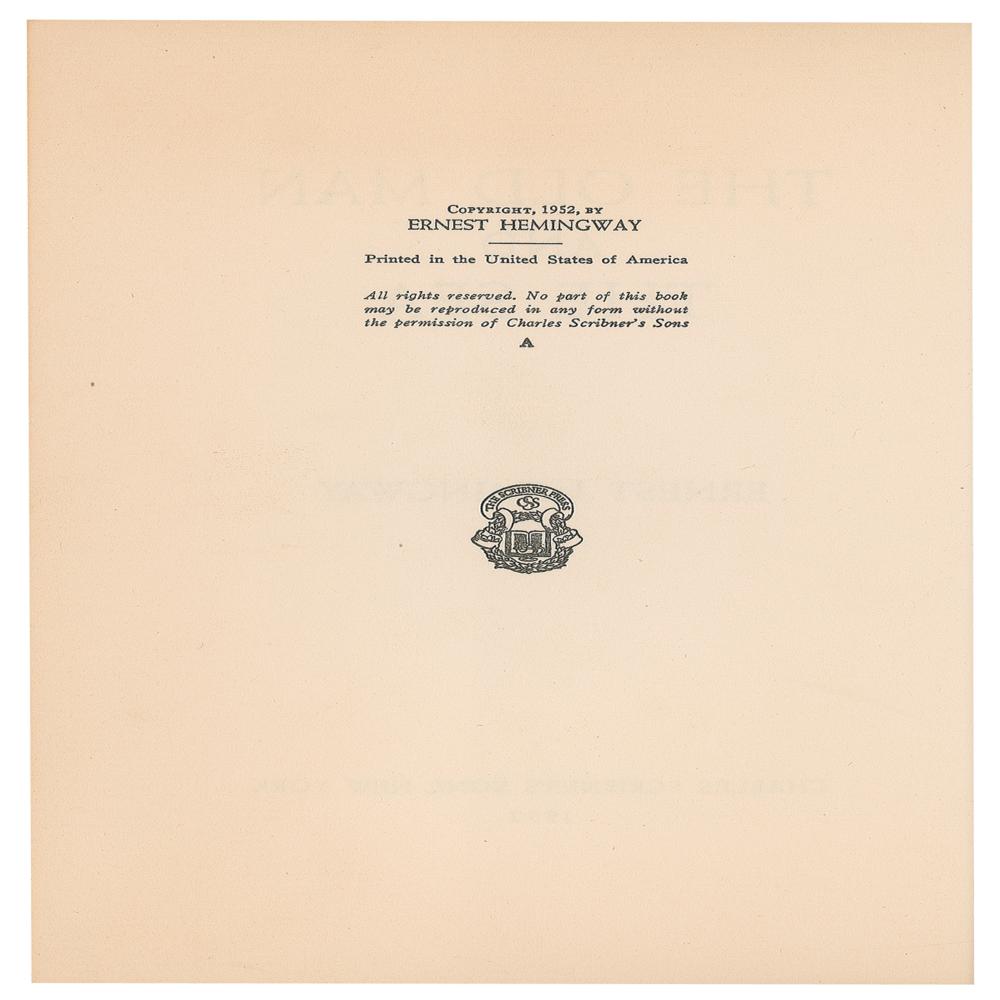 Desirable unsigned book: The Old Man and the Sea. First edition, first printing (with “A” and Scribner’s seal on copyright page); in original dust jacket (with $3.00 price intact). NY: Charles Scribner's Sons, 1952. Hardcover with dust jacket, 5.75 x 8.25, 140 pages. Book condition: VG-/VG, with toned adhesive remnants to endpapers (bleeding through to half-title page), staining to bumped corners, and chips and wear to spine ends of the book and dust jacket. Accompanied by a framed issue of the September 1, 1952 issue of Life Magazine, in which The Old Man and the Sea was first published. Written during a two-month span in 1951, The Old Man and the Sea was published in a limited run of 50,000 copies in September of 1952. In conjunction with its wildly popular publication in Life Magazine, the novella earned immediate critical and commercial success, reaffirming Hemingway’s place as a novelist, and subsequently rewarding him with both the Pulitzer and Nobel Peace Prize. A definitive piece of the American literary canon.