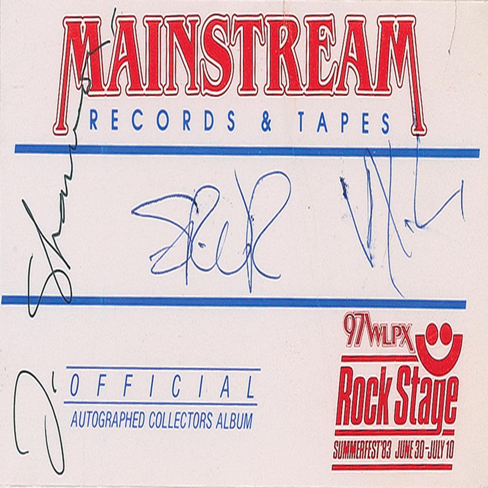 Ballpoint and ink signatures of Stevie Ray Vaughan, Chris Layton, and Tommy Shannon on a 6.25 x 3.5 vinyl sticker from the Mainstream Records & Tapes merchandise booth at the 1983 Summerfest music festival in Milwaukee, Wisconsin. In very good to fine condition, with diagonal creasing to the right of Vaughan's signature and plastic affixed to back of sticker. Consignor notes that the band signed the sticker after their set on July 1, 1983, as part of their Texas Flood Tour. Accompanied by a laminated VIP pass from the Stevie Ray Vaughan and Double Trouble In Step Tour of 1989-1990 and an unsigned Epic Records publicity photo of Vaughan.