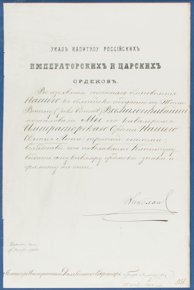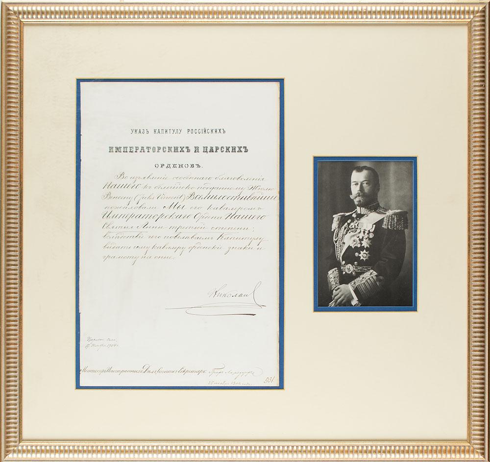 Partly-printed DS in Cyrillic, one page, 8.75 x 13.5, November 17, 1904. Legal document issued from Tsarskoe Selo and headed (translated) "Edict to the Chapter of Russian Imperial and Royal Orders," in full: "In expression of our special good will toward Belgian national Jules Vincent, We most graciously have bestowed upon him the title of Cavalier of Our Imperial Order of Santa Anna, third class; in consequence of which, we command the Chapter to issue this Cavalier the medals and document related to this honor." Signed neatly at the conclusion by Nicholas II. Mounted, matted, and framed with a portrait of the Russian Emperor to an overall size of 21.75 x 20.5. In fine condition, with a lightly trimmed left edge, and thin toning along the right edge.