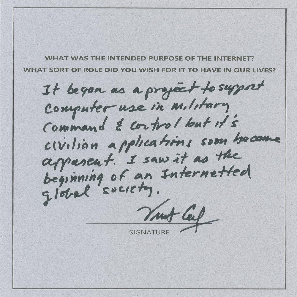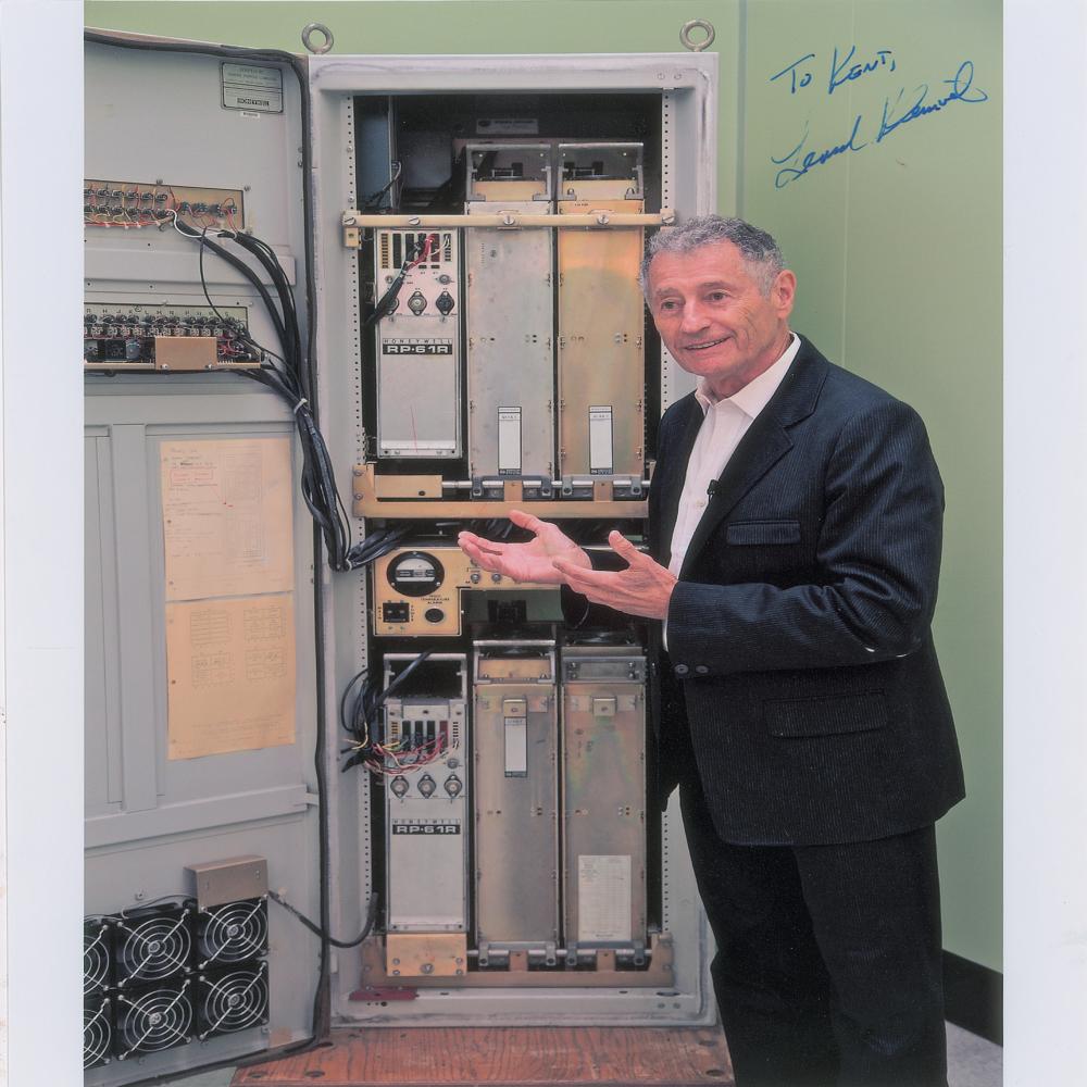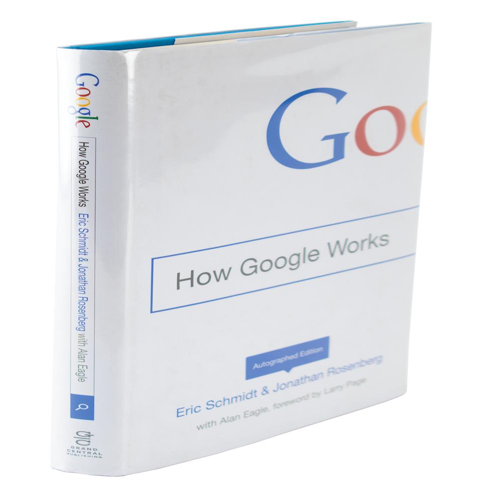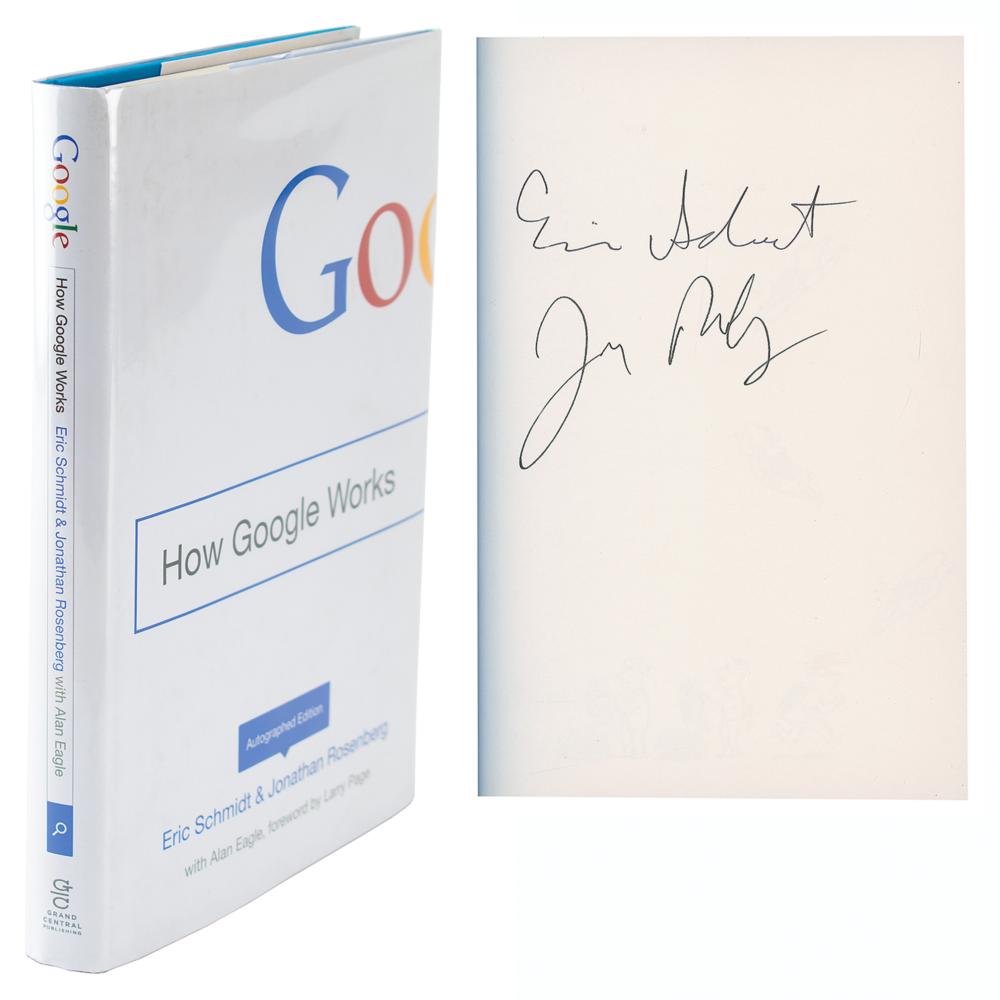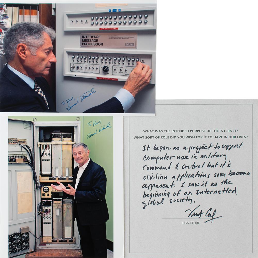 Four items: a pair of color satin-finish photos, 8 x 10 and 10 x 8, showing Leonard Kleinrock next to the Interface Message Processor, or IMP, which was used to send the first message on the internet in 1969, both signed and inscribed in blue ink, "To Kent, Leonard Kleinrock"; an AQS from Vint Cerf on an off-white 8.5 x 11 sheet with typed question asking Cerf the purpose of the Internet and what role he hoped it would serve, with Cerf responding: "It began as a project to support computer use in military command & control but it's civilian applications soon became apparent. I saw it as the beginning of an Internetted global society. Vint Cerf"; and a first edition of How Google Works, hardcover with dust jacket, signed on an opening page in black ink, "Eric Schmidt" and "Jonathan Rosenberg." In overall fine condition.