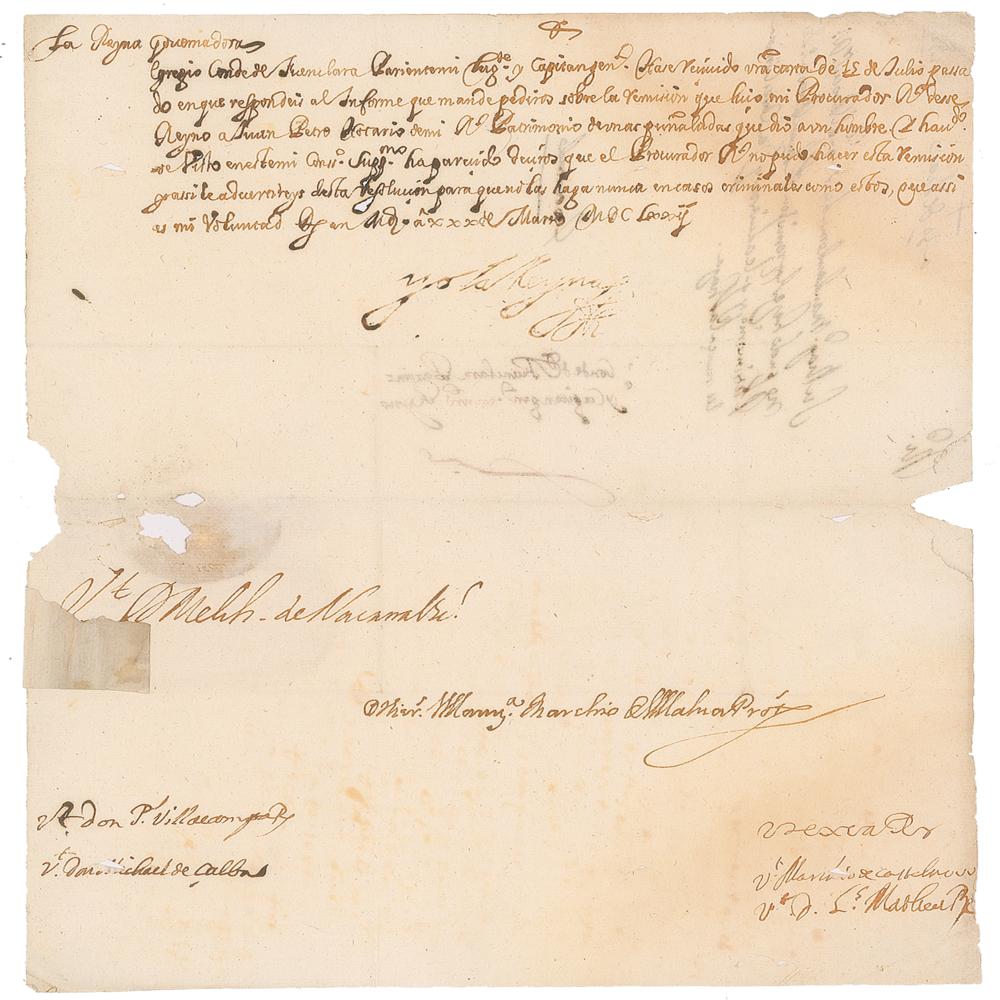 Holy Roman Empress and Queen of Hungary and Bohemia by marriage to Ferdinand III, Holy Roman Emperor (1606-1646) who acted as regent on several occasions during the absences of her spouse. Untranslated manuscript DS in Spanish, signed “Yo la Reyna,” one page, 8.5 x 11.5, March 30 [1642]. In very good condition, with areas of paper loss and ink erosion, and the signature light due to decreased ink flow.