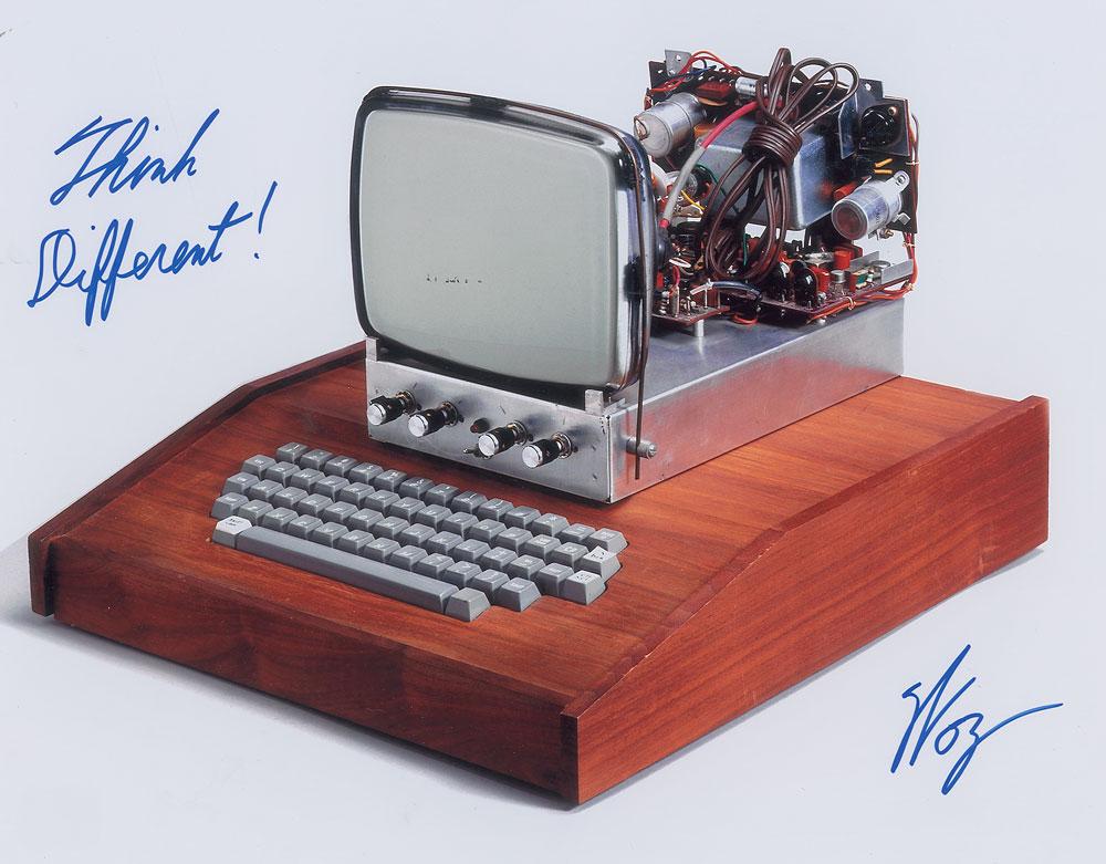 Color glossy 14 x 11 photo of an Apple-1 computer, signed in blue felt tip, "Think Different! Woz." In very fine condition.
