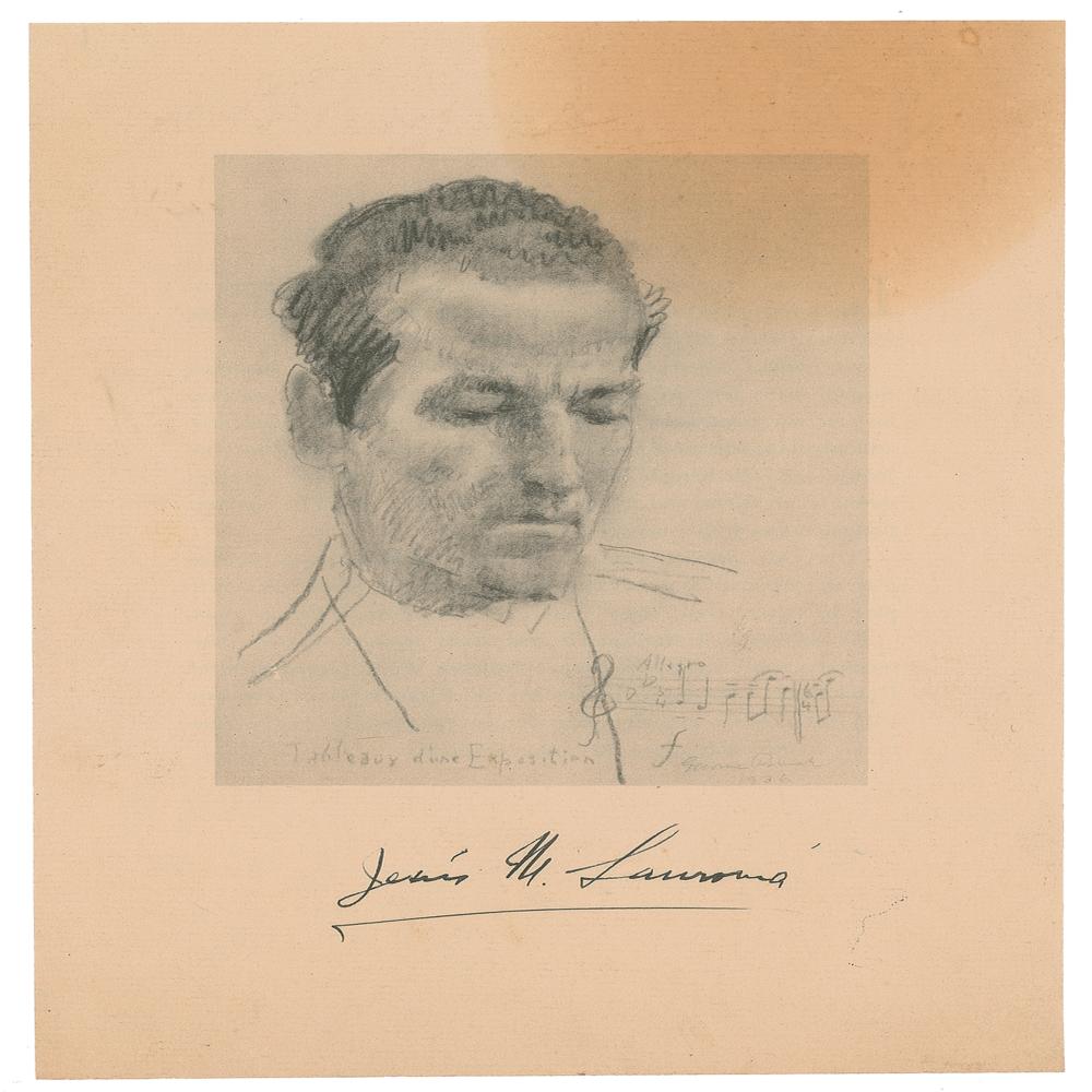 Puerto Rican pianist (1902-1984) who is one of the 20th century's most accomplished and important pianists. Uncommon 7.25 x 9.5 book photo of an artistic rendering of Jesús María Sanromá, signed below in bold black ink. In very good to fine condition, with a semicircular stain to the upper right. From the collection of Stephen Adamson.