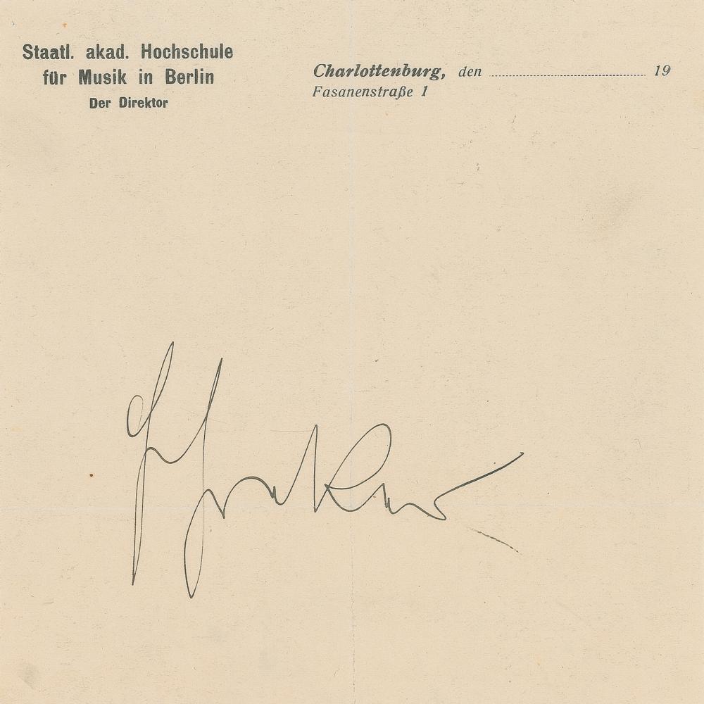 German composer (1878-1934) best known for his operas and orchestral music. Schreker, a Jew, was denounced by the Nazis for the production of 'Entartete' music, placing him in the company of such 'rejects' as Mendelssohn, Mahler, and Schoenberg. Fountain pen signature, "F. Schreker,” on an off-white 5.75 x 5.75 sheet of letterhead from the State Academic University of Music in Berlin. In fine condition, with intersecting folds. From the collection of Stephen Adamson.