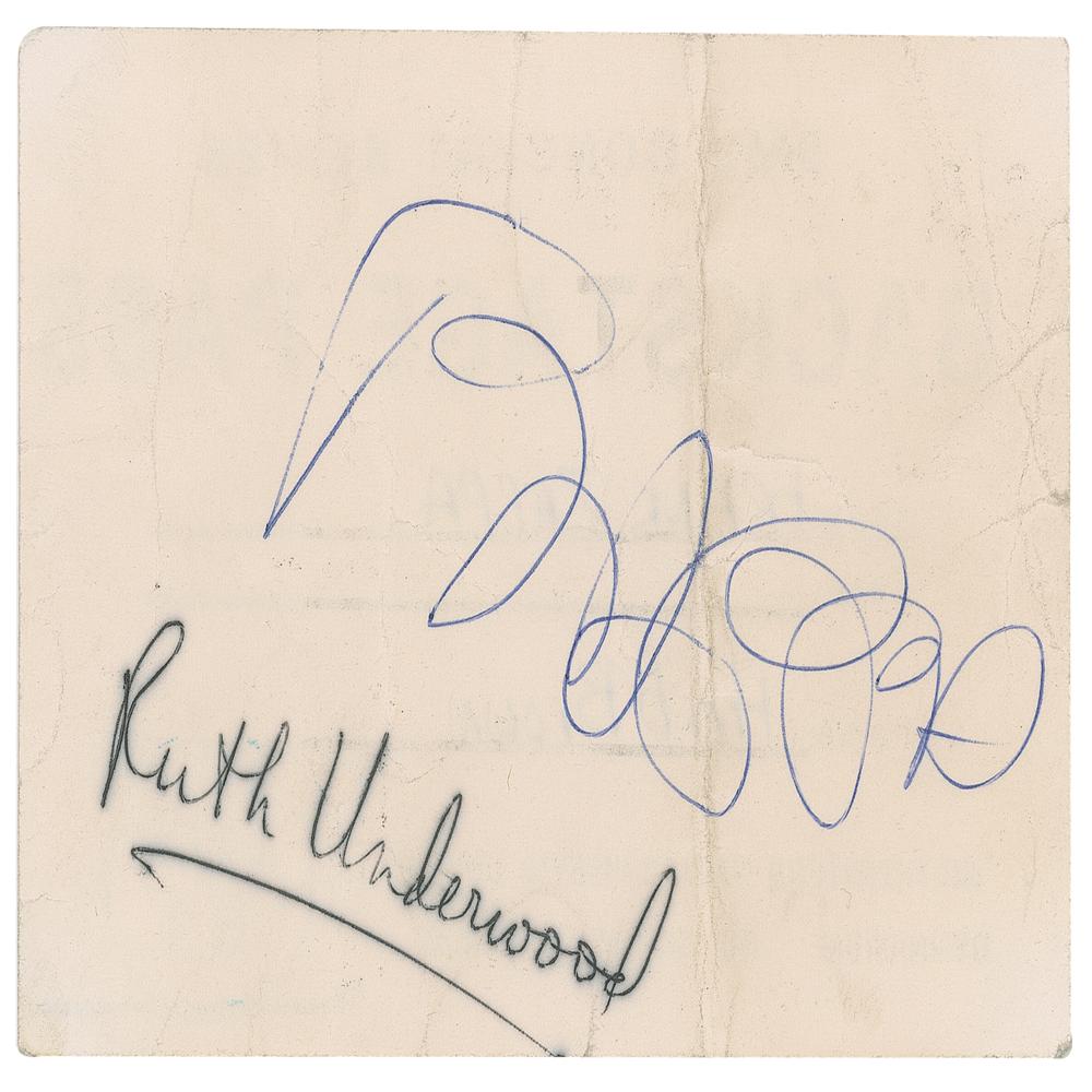 Sought-after ballpoint signature, "Frank Zappa,” on the reverse of off-white 5 x 3.5 backstage pass for a Zappa concert at Southeastern Massachusetts University. The pass is also signed by percussionist Ruth Underwood. In very good condition, with overall creasing and a vertical fold. On December 2, 1973, Zappa and The Mothers of Invention played at the Southeastern Massachusetts University Gym in North Dartmouth, Massachusetts, with the support of Tom Waits, who recalls the tour fondly: 'Oh, it didn't go over. It was a complete mismatch?I had fun, some nights. But I had to have Frank on stage to keep them from hurting me. They were Frank's people, you know? They didn't want to hear anybody. And they thought that whoever was coming out before Frank, Frank had designed it that way and wanted them to hurt me: pelt me, throw things at me and abuse me. And the chant: 'We! Want! Frank!' Or 'You suck!' was also a big favourite.' From the collection of Stephen Adamson.