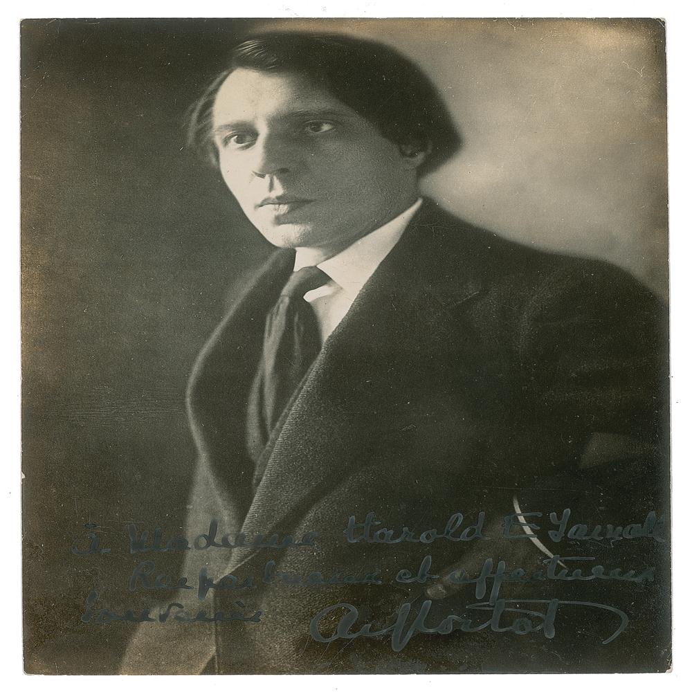 Franco-Swiss pianist and conductor (1877-1962) known for his Romantic period piano works, particularly those of Chopin and Schumann, and considered one of the most renowned 20th-century classical musicians. Vintage pearl-finish 4.5 x 6.5 photo of Alfred Cortot in a half-length pose, signed and inscribed in fountain pen, "A Madame Harold E. Yainoll, respectueux et affectueux souvenir, Alf. Cortot.” In very good to fine condition, with light silvering to the darker areas of the image, and some shiny emulsion irregularity to the bottom edge. From the collection of Stephen Adamson.