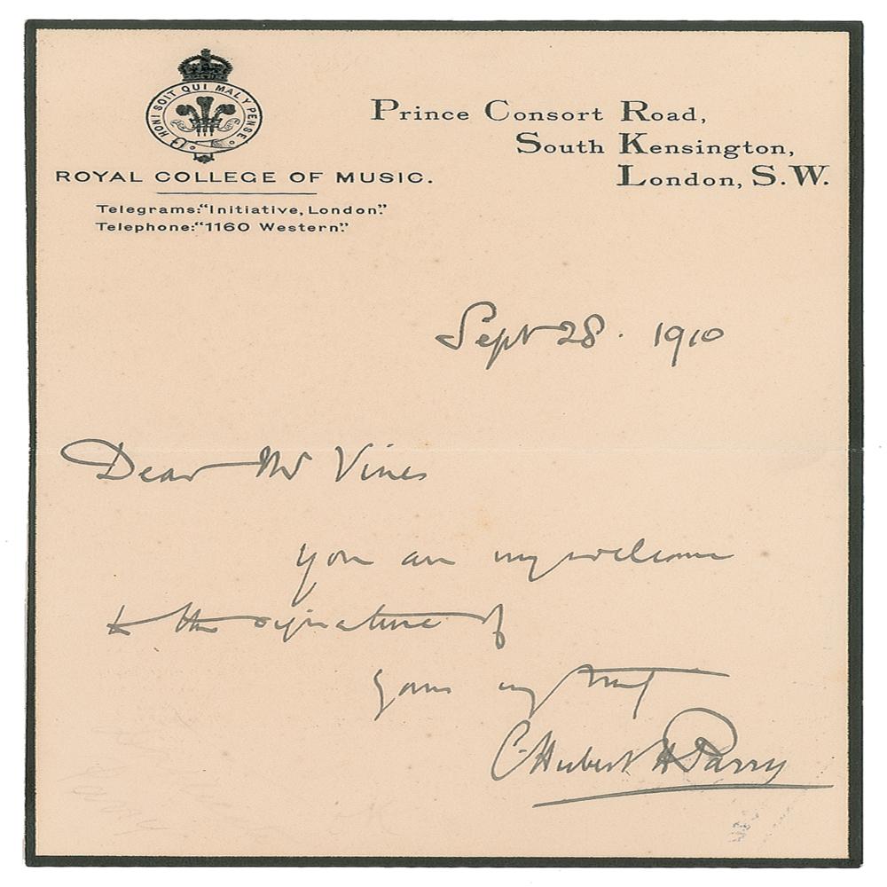 English composer, teacher and historian of music (1848-1918) who is best known for the choral song 'Jerusalem,' his 1902 setting for the coronation anthem 'I Was Glad,' the choral and orchestral ode 'Blest Pair of Sirens,' and the hymn tune 'Repton.' Rare ALS signed “C. Hubert Parry,” one page, 4.5 x 7, Royal College of Music letterhead, September 28, 1910. Brief letter to Mr. Vines forwarding his autograph, in full: "You are very welcome to the signature of?" In fine condition. From the collection of Stephen Adamson.