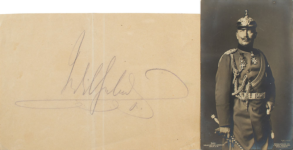 Large vintage pencil signature, "Wilhelm,” on an off-white 7.25 x 5 sheet. In very good to fine condition, with two central vertical folds. Accompanied by an unsigned postcard photo of Kaiser Wilhelm II. From the collection of Stephen Adamson.