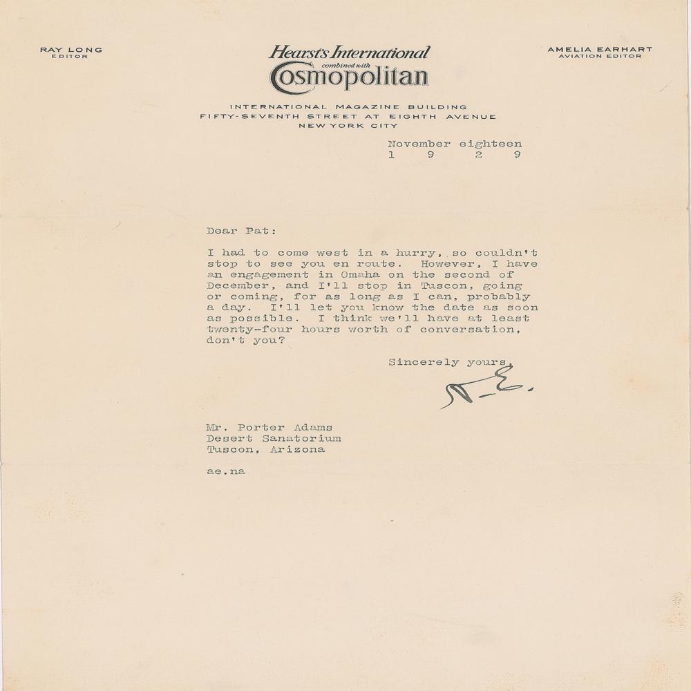 TLS signed “A. E.,” one page, 7.25 x 10.5, Cosmopolitan letterhead, November 18, 1929. Letter to Porter Adams, in part: "I had to come west in a hurry, so couldn't stop to see you en route. However, I have an engagement in Omaha on the second of December, and I'll stop in Tucson, going or coming, for as long as I can, probably a day. I'll let you know the date as soon as possible. I think we'll have at least twenty-four hours worth of conversation, don't you?" In fine condition. From the collection of Stephen Adamson.