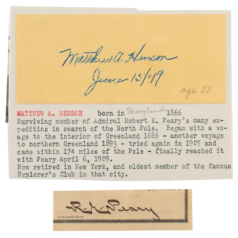 Two items: a bold ink signature of Robert Peary, "R. E. Peary," on a 3.75 x 1 slip clipped from a check; and a ballpoint signature of his 'first man,' "Matthew A. Henson, June 15/49," on a 5.5 x 2 card. In fine condition. Accompanied by a brief note sent to a collector in 1902, written in an unknown hand, relating that Peary has been in the arctic regions for four years and thus cannot reply to an autograph request. From the collection of Stephen Adamson.