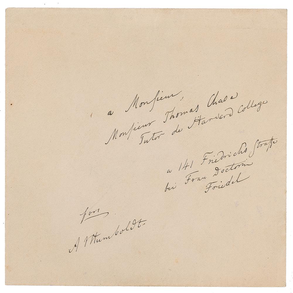 Mailing envelope penned in the hand of Alexander von Humboldt, 5.75 x 4.5, addressed by Humboldt in French and German to "Monsieur Thomas Chase, Tutor de Harvard College, a 141 Friedrichs Strasse, bei Fran Doctor Friedel," and signed in the lower left, "A. V. Humboldt." In fine condition. From the collection of Stephen Adamson.