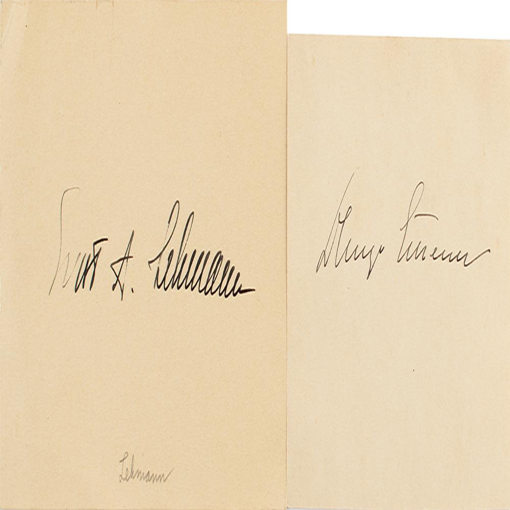 Uncommon fountain pen signatures, "Hugo Eckener" and "Ernst A. Lehmann," on individual off-white cards measuring 3.75 x 2.75 and 5 x 3. In overall fine condition. From the collection of Stephen Adamson.