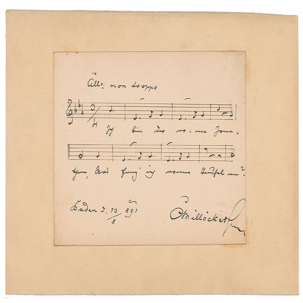 Austrian composer of operettas and a conductor (1842-1899). AMQS on an off-white 4.5 x 3.5 card, signed below in black ink, "C. Millocker, Baden, 10/8 891," who adds lyrics and eight bars of music from an unknown work, noting a tempo of "All'o non troppo." The quotation is affixed to an off-white 7 x 5.25 card. In fine condition. From the collection of Stephen Adamson.