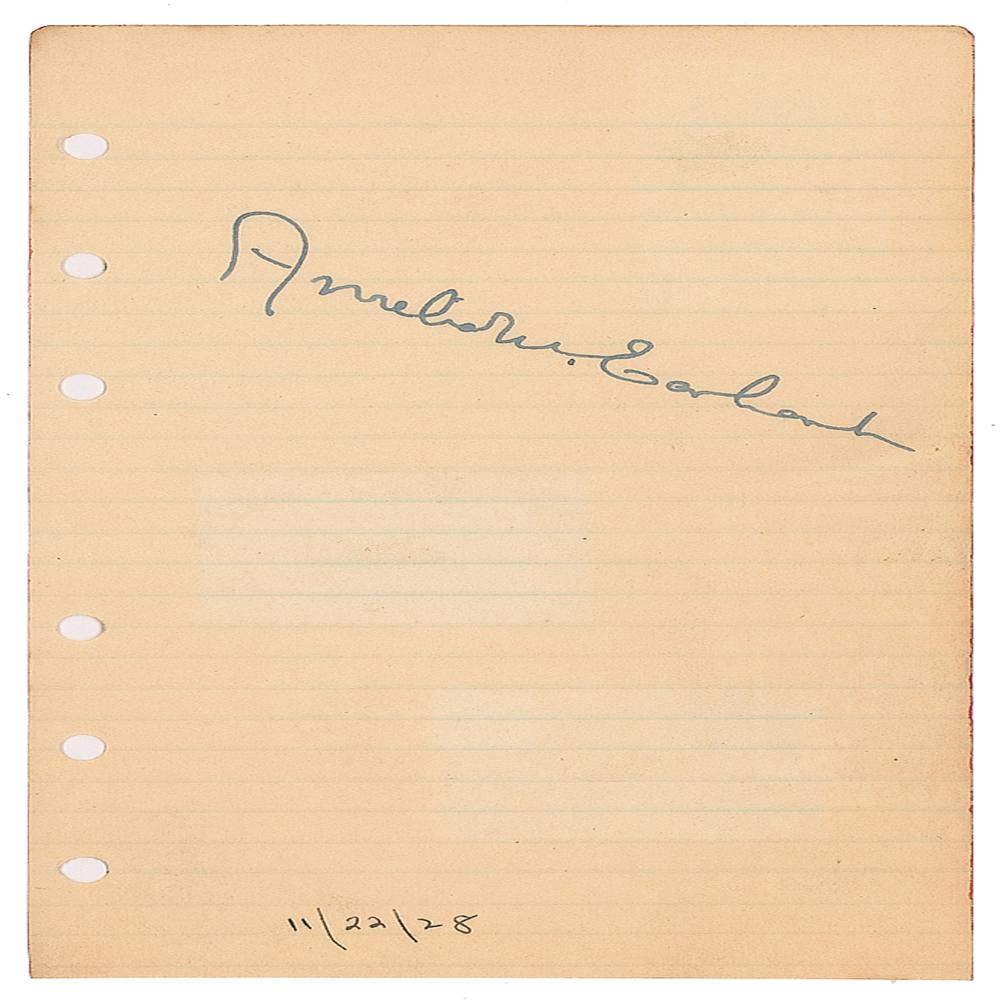 Vintage fountain pen signature, "Amelia M. Earhart,” on an off-white 3.5 x 6 sheet, annotated "11/22/28" in another hand. In fine condition, with slightly irregular light toning. From the collection of Stephen Adamson.