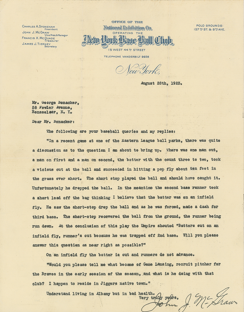 Rare TLS signed “John J. McGraw,” one page, 8.5 x 11, New York Base Ball Club letterhead, August 28, 1923. Letter to George Benacker, in full: "The following are your baseball queries and my replies: