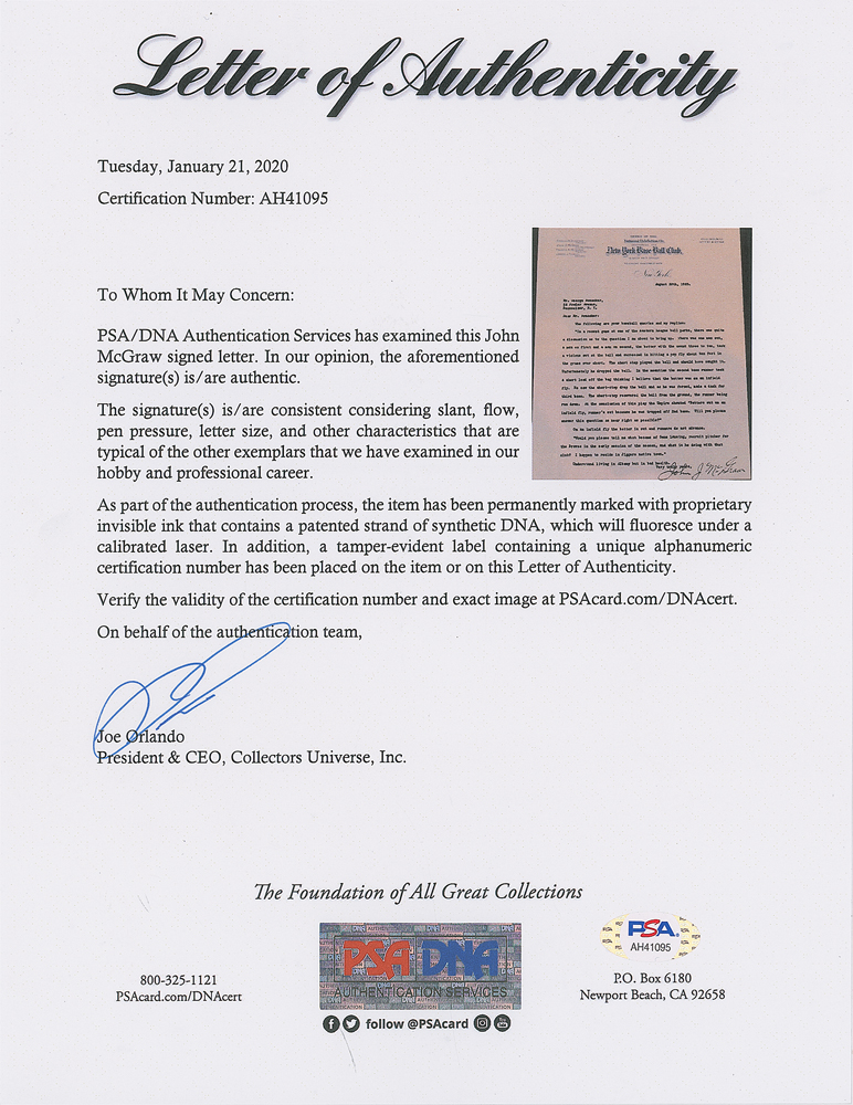 McGraw: "Understand living in Albany but in bad health." In fine condition. Accompanied by a full letter of authenticity from PSA/DNA.