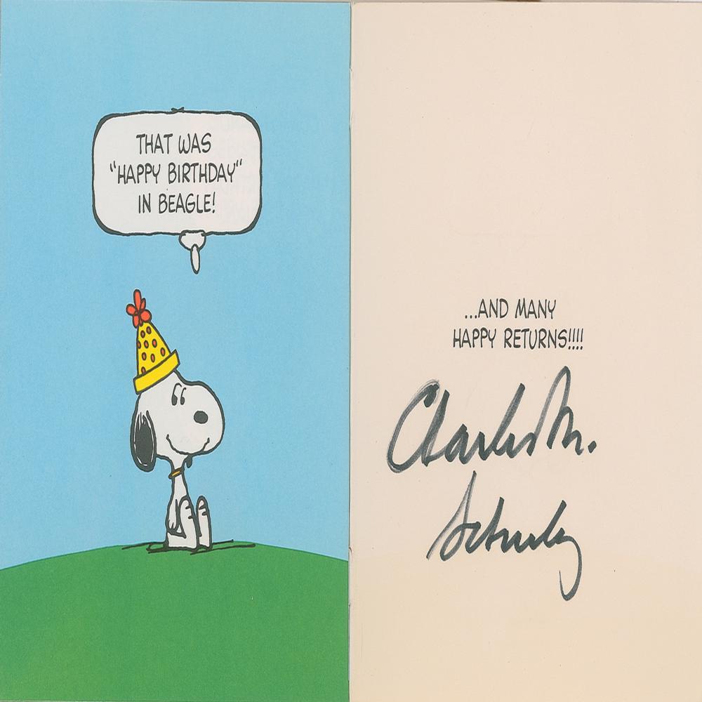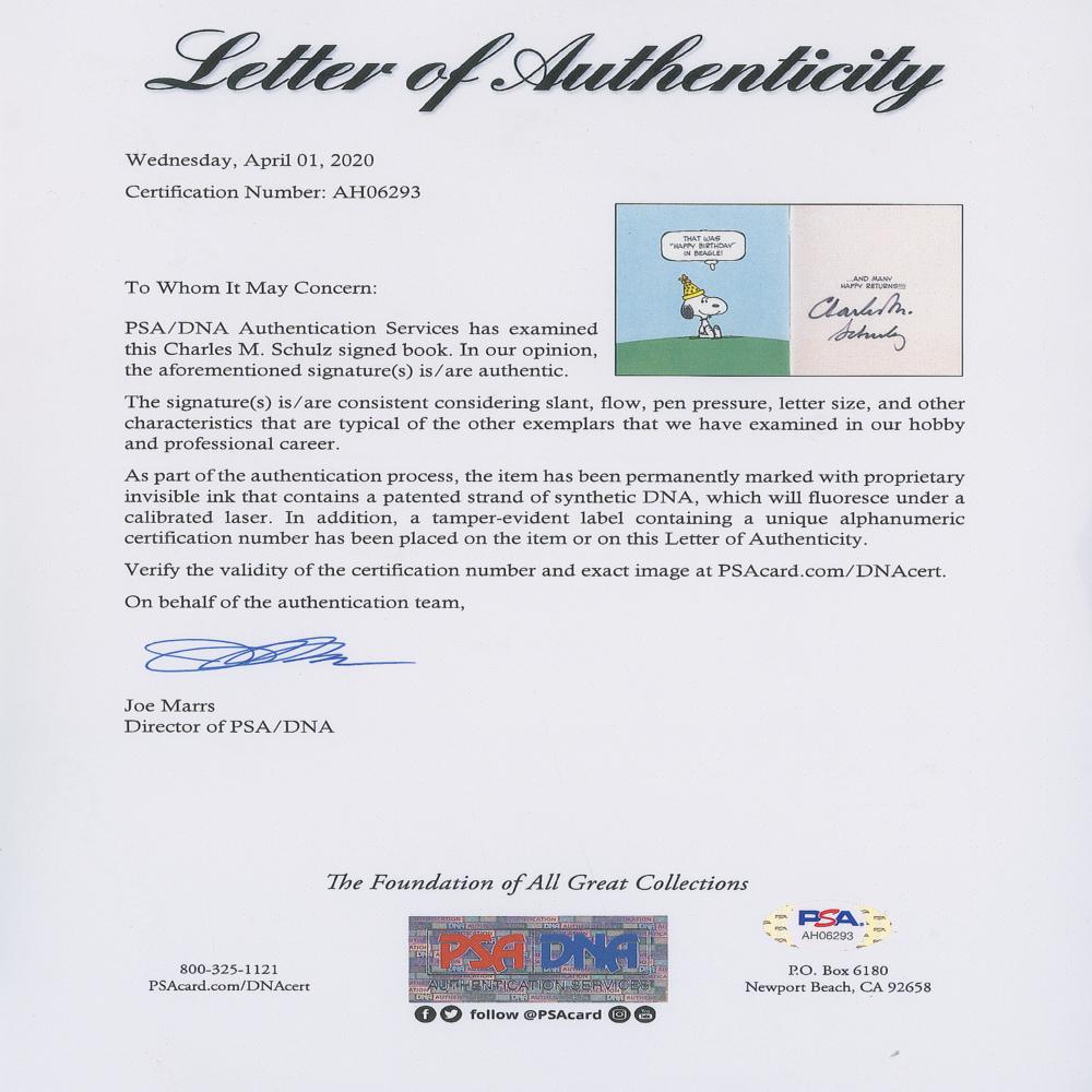 Uncommon Peanuts birthday card booklet published by Hallmark, 28 pages, 5 x 6.25, signed inside the back cover in black felt tip, "Charles M. Schulz." The unusual booklet features all the beloved Peanuts characters and bears a printed greeting above Schulz' signature, "?and many happy returns!!!!" In very fine condition. Accompanied by a full letter of authenticity from PSA/DNA.