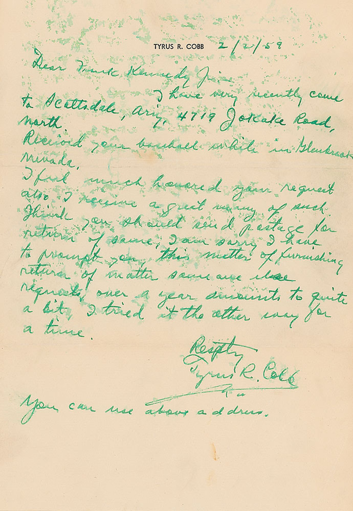 ALS signed “Tyrus R. Cobb,” one page, 7.25 x 10.5, personal letterhead, February 2, 1959. Letter to Frank Kennedy, Jr., in full: "I have very recently came to Scottsdale, Ariz., 4719 Jokake Road, North. Received your baseball while in Glenbrook, Nevada. I feel much honored [by] your request also I receive a great many of such. Think you should send postage for return of same; I am sorry I have to prompt you, this matter of furnishing return of matter someone else requests over a year amounts to quite a bit, I tried it the other way for a time." Cobb adds at the conclusion: "You can use above address." In fine condition, with moisture-related offsetting to the text. Accompanied by a full letter of authenticity from PSA/DNA.