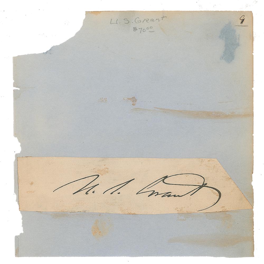 Bold ink signature, "U. S. Grant,” on an off-white 4.5 x 1 slip affixed to a larger album page. In very good to fine condition, with some light staining. From the collection of Stephen Adamson.