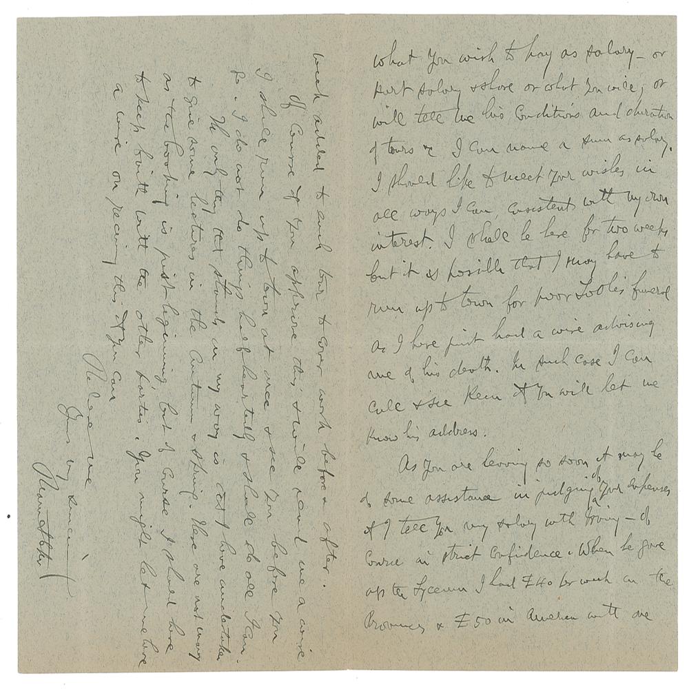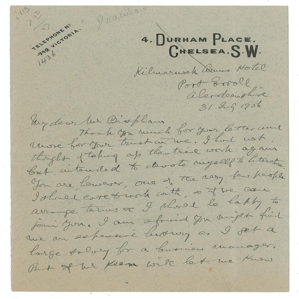 ALS, three pages on two adjoining sheets, 4.5 x 7, personal letterhead, July 31, 1906. Letter to "Mr. Bispham," in part: "I had not thought of taking up theatrical work again but intended to devote myself to literature. You are, however, one of the very few people I should care to work with, so if we can arrange terms &c I shall be happy to join you?let me know what you wish to pay as salary?I should like to meet your wishes in all ways I can, consistent with my own interest?It may be some assistant in judging your expenses if I tell you my salary with Irving—of course in strict confidence. When he gave up the Lyceum I had £40 per week?The only thing that stands in my way is that I have undertaken to give some lectures in the Autumn & Spring." In fine condition.