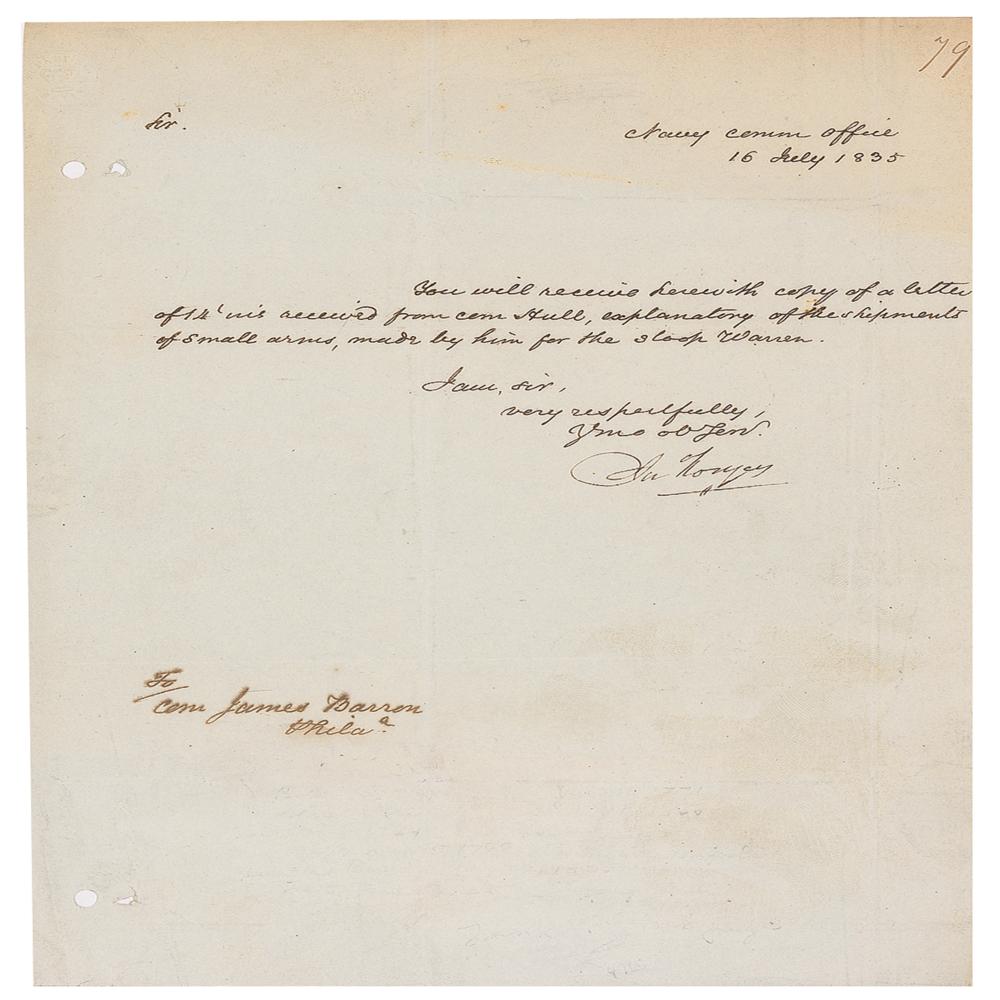 Commodore in the US Navy (1772-1838) who served in the Quasi-War with France, both Barbary Wars in North Africa, and the War of 1812 with Britain, and played a major role in the development of the standards, customs, and traditions of the American navy. LS signed “Jn. Rodgers,” one page, 7.5 x 9.75, July 16, 1835. Letter to Commodore James Barron, in full: "You will receive herewith copy of a letter of 14th ins. received from Com. Hull, explanatory of the shipments of small arms, made by him for the Sloop Warren." In fine condition, with file holes to the left side. From the collection of Stephen Adamson.