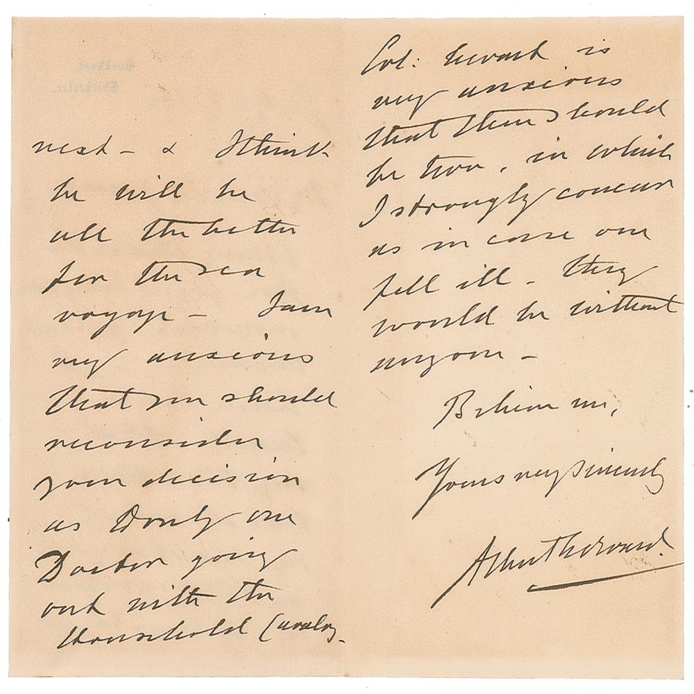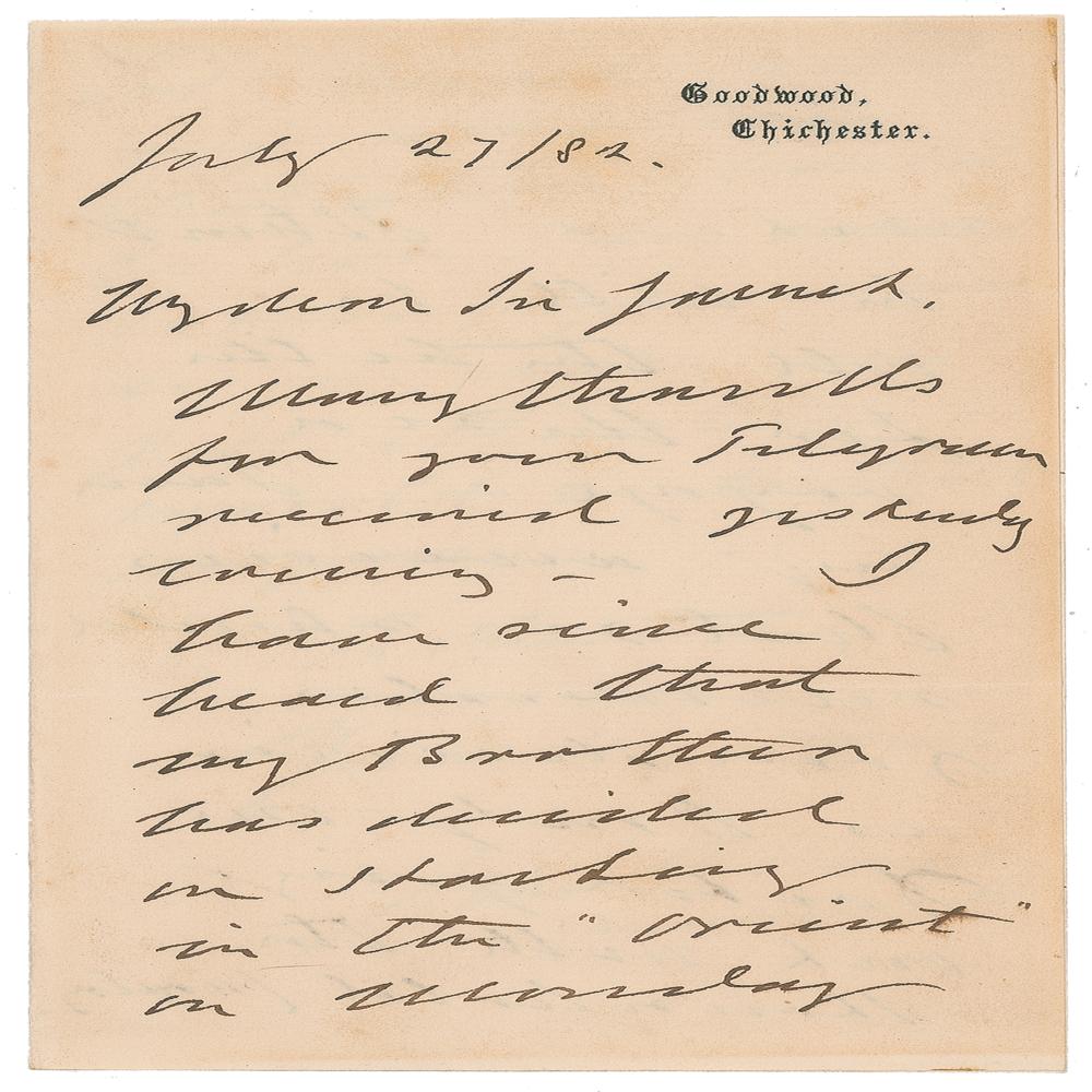 ALS signed “Albert Edward,” three pages on two adjoining sheets, 4.25 x 6.5, Goodwood letterhead, July 27, 1882. In part: "Many thanks for your telegram received yesterday evening. I have since heard that my brother has decided on starting in the 'Orient' on Monday next—& I think he will be all the better for the sea voyage." In fine condition, with faint toning from prior display. From the collection of Stephen Adamson.