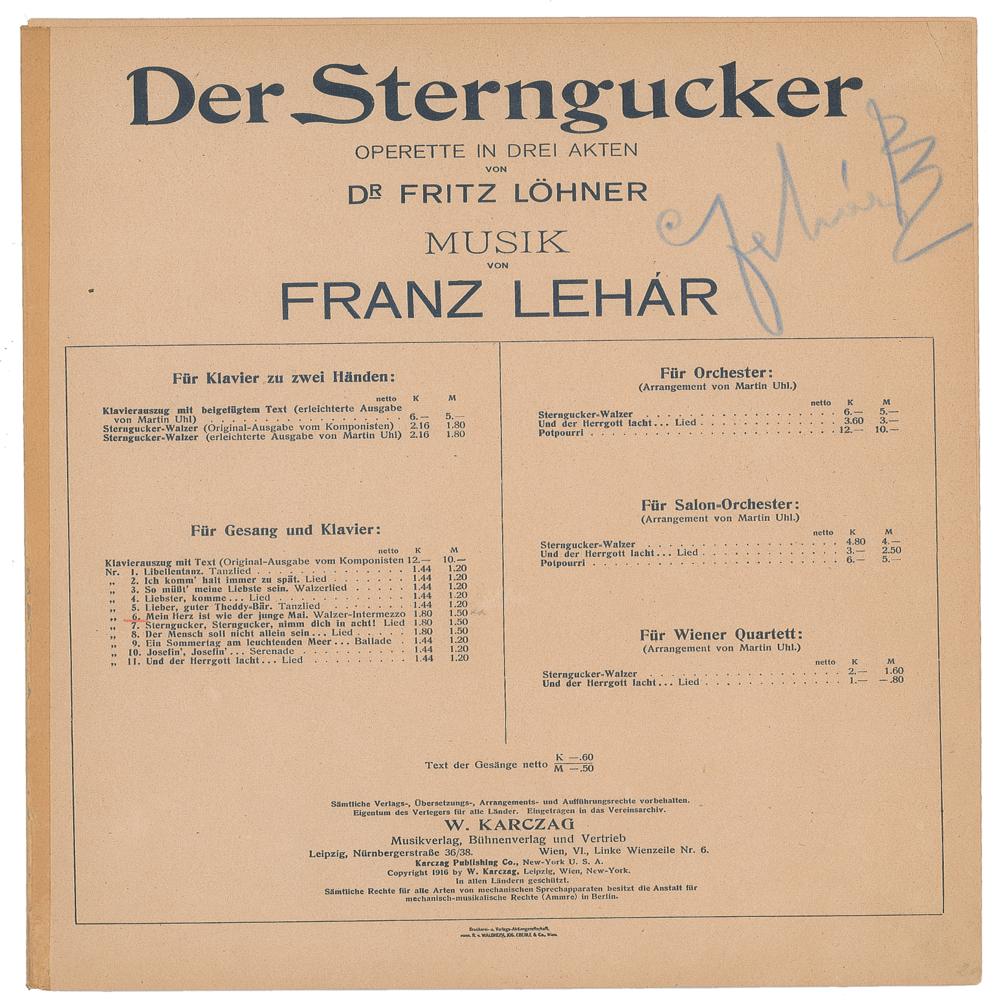 German sheet music booklet for 'Mein Herz ist wie der junge Mai' from the opera 'Der Sterngucker,' nine pages, 10.5 x 13, prominently signed on the front cover in pencil by Franz Lehar. In fine condition, with old tape along the hinge. From the collection of Stephen Adamson.