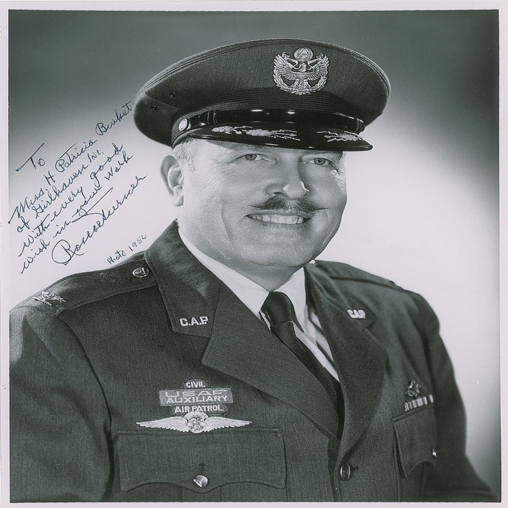 American aviator (1895-1970) who set the east-to-west transcontinental speed record in 1930. Glossy 8 x 10 photo of Turner in uniform, signed and inscribed in black ballpoint, "To Miss H. Patricia Burket of Girlhaven Inc., with every good wish in your work, Roscoe Turner, Photo 1956.” In fine condition, with lightly-trimmed edges. From the collection of Stephen Adamson.