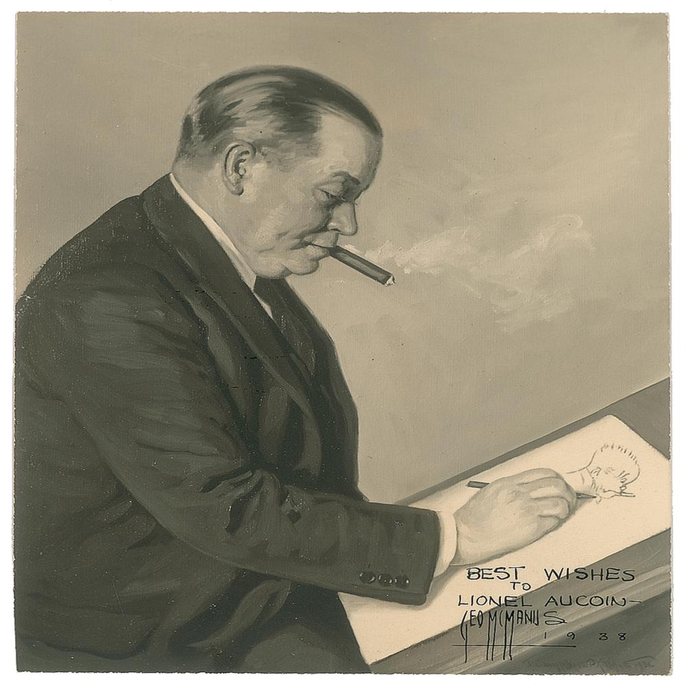 Vintage matte-finish 4.25 x 5.25 photo of a portrait of the cartoonist at work, signed and inscribed in black ink, "Best Wishes to Lionel Aucoin, Geo. McManus, 1938.” In very fine condition. From the collection of Stephen Adamson.
