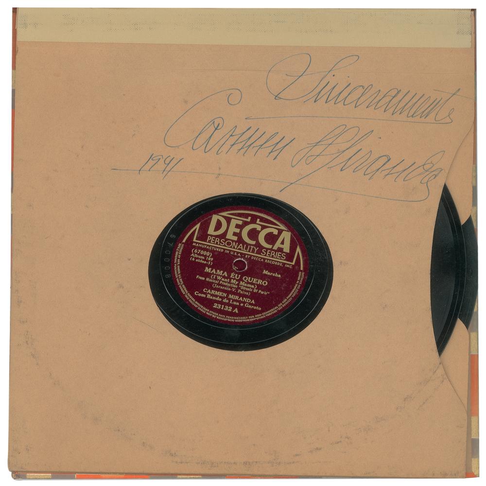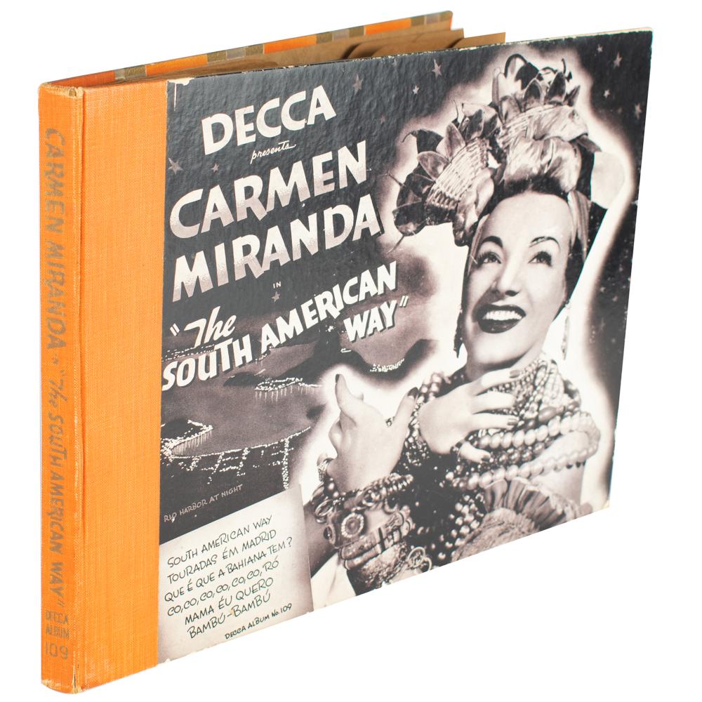 Decca Personality Series Album No. 109 entitled "Carmen Miranda in 'The South American Way,'" signed on the opening album sleeve in black ink, "Sinceramente, Carmen Miranda, 1941." In fine condition. The 10″ records are included. From the collection of Stephen Adamson.