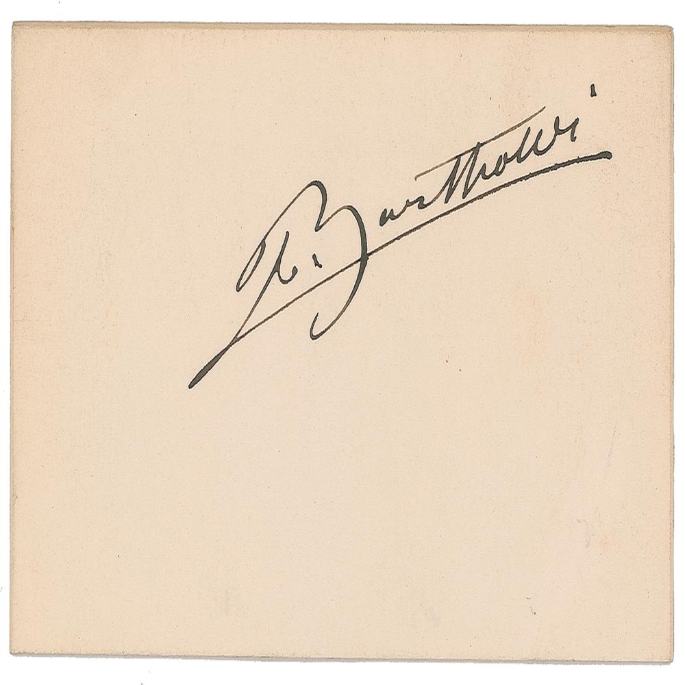 Eminent French sculptor (1834-1904) best known for designing the Statue of Liberty. Bold fountain pen signature, "Bartholdi,” on an off-white 4.5 x 2 card. In very fine condition. From the collection of Stephen Adamson.