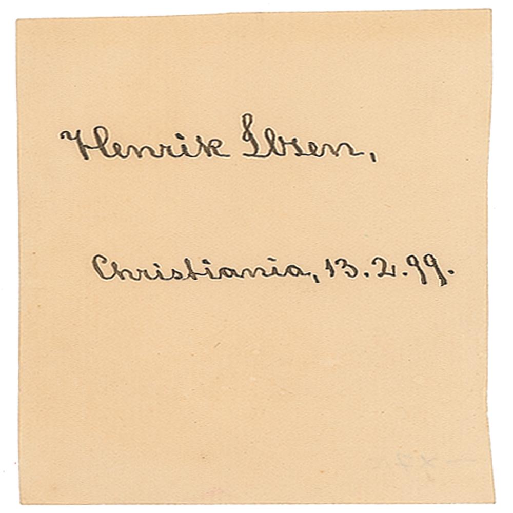 Revered Norwegian playwright and poet (1828-1906) whose works, including A Doll's House and Hedda Gabler, made him one of the seminal figures of modern drama. Rare fountain pen signature, "Henrik Ibsen, Christiania, 13.2.99.,” on an off-white 2.75 x 3.75 sheet. In fine condition, with light overall wrinkling. From the collection of Stephen Adamson.