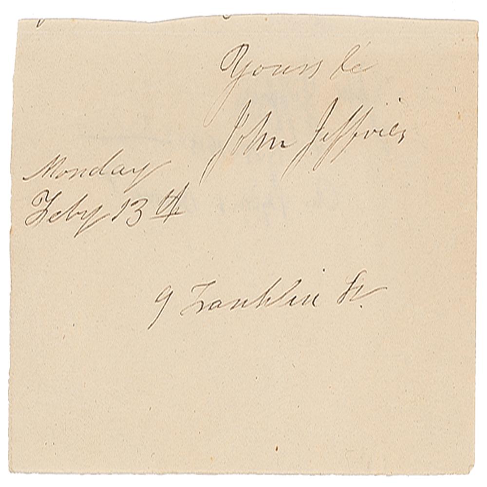 Boston physician and scientist (1745-1819) who was a military surgeon with the British Army in Nova Scotia and New York during the American Revolution; he is best known for accompanying Jean-Pierre Blanchard on his 1785 balloon flight across the English Channel. Rare ink signature, "Yours le, John Jeffries, Monday Feby 13th, 9 Franklin St.,” on an off-white 4.75 x 3 sheet clipped from the close of a letter. In fine condition. From the collection of Stephen Adamson.