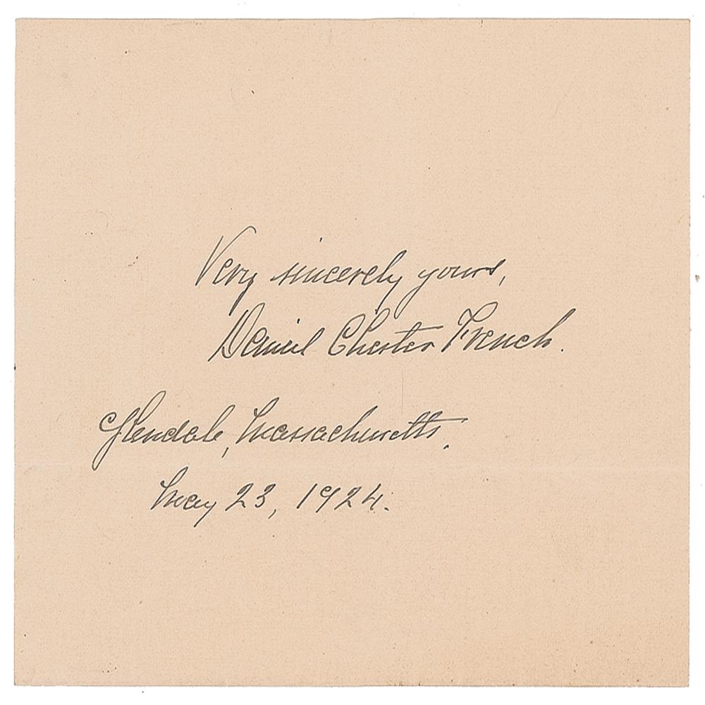 American sculptor (1850-1931) best known for his monumental historical works, most notably the sculpture that forms the centerpiece of the Lincoln Memorial. Fountain pen signature, "Very sincerely yours, Daniel Chester French, Glendale, Massachusetts, May 23, 1924,” on an off-white 6.5 x 5 sheet. In fine condition, with a horizontal fold. From the collection of Stephen Adamson.