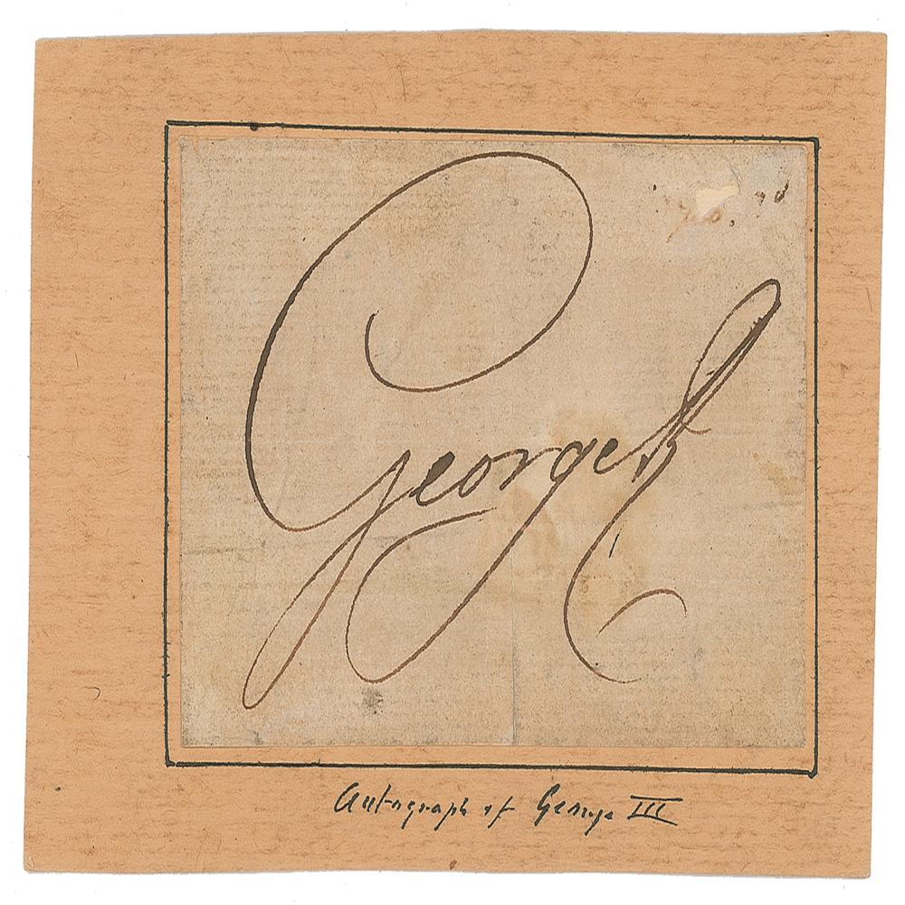 Ink signature, "George R.,” on an off-white 3.5 x 2.25 slip clipped from a document. The slip is affixed to a slightly larger sheet. In very good condition, with light soiling and staining, and a small hole to the upper right corner. From the collection of Stephen Adamson.