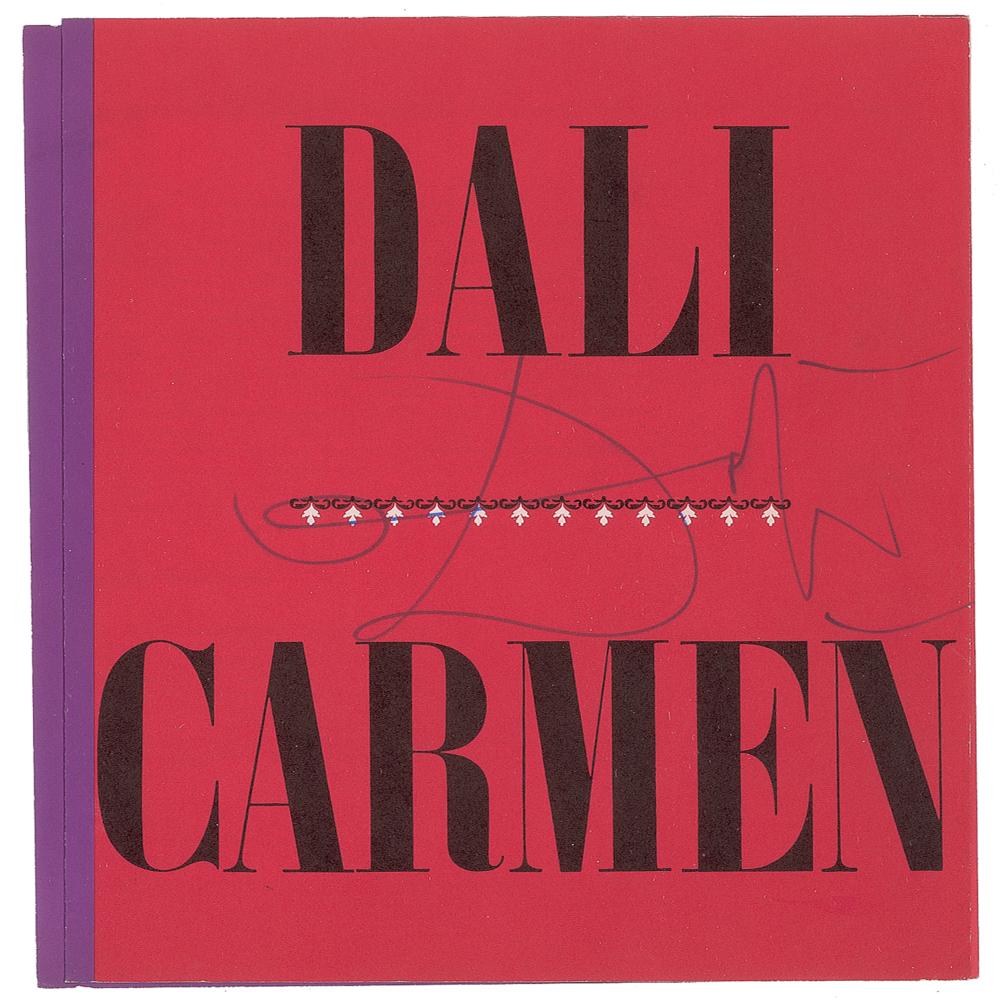 Tri-fold program for Dali's Carmen lithograph suite, 7.5 x 9.25, prominently signed on the front cover in pencil, "Dali." In fine condition. Produced in 1970, Dali created a series of 25 lithographs based on George Bizet's masterpiece. The suite was published by Shorewood Publishers, New York, in an edition of 276 plus proofs. From the collection of Stephen Adamson.