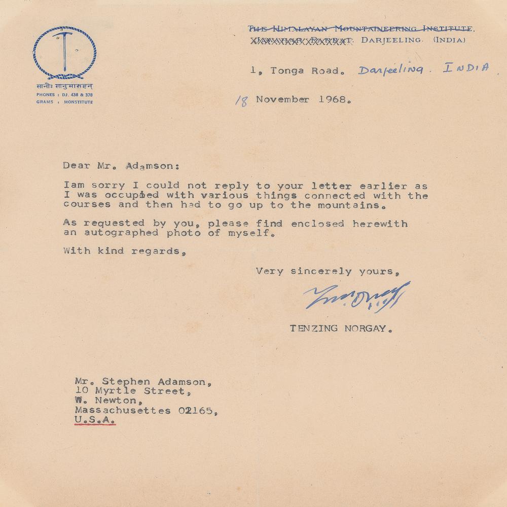 TLS, one page, 7.5 x 9, Himalayan Mountaineering Institute letterhead [struck through], November 18, 1968. Letter to Stephen Adamson, in part: "I am sorry I could not reply to your letter earlier as I was occupied with various things connected with the courses and then had to go up to the mountains." In fine condition, with a light diagonal crease. From the collection of Stephen Adamson.