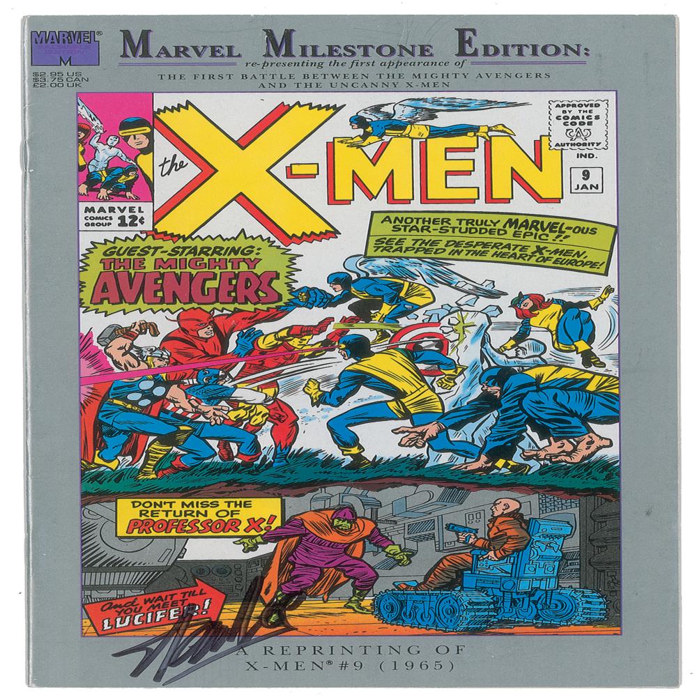 Marvel Milestone Edition reprint of X-Men #9, containing the first battle between the mighty Avengers and the uncanny X-Men, 6.5 x 10.5, signed on the front cover in black felt tip by Stan Lee. In fine condition.