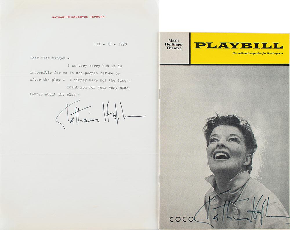 Two items: a TLS, one page, personal letterhead, March 15, 1970, in part: "I am very sorry but it is impossible for me to see people before or after the play—I simply have not the time"; and a Playbill for Coco at the Mark Hellinger Theatre in March 1970, signed on the front cover in black felt tip by Hepburn. In fine condition. Accompanied by the original mailing envelope for the signed Playbill.