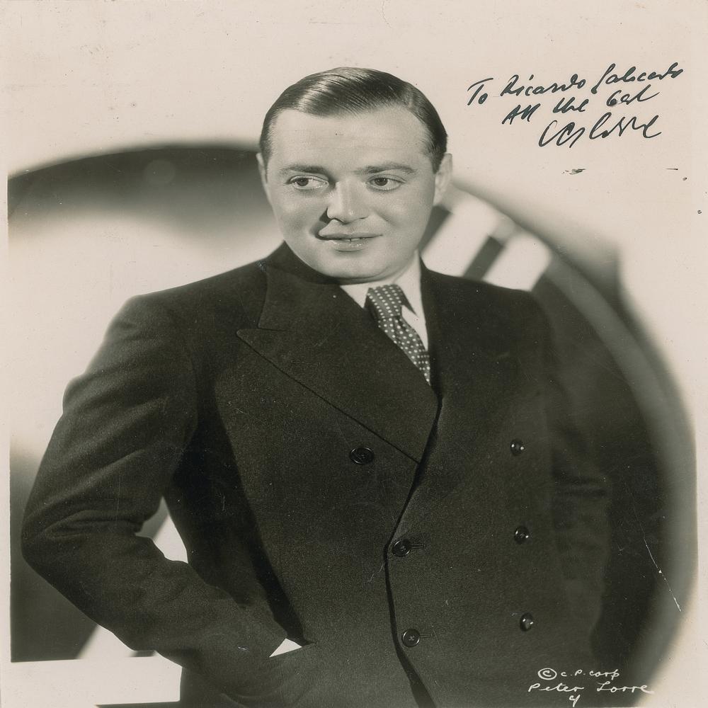 Sharp vintage glossy 7.5 x 10 photo of Lorre in a suit and tie, boldly signed and inscribed in fountain pen. In very good to fine condition, with trimmed edges, scattered creasing, and a short tear to the top edge.
