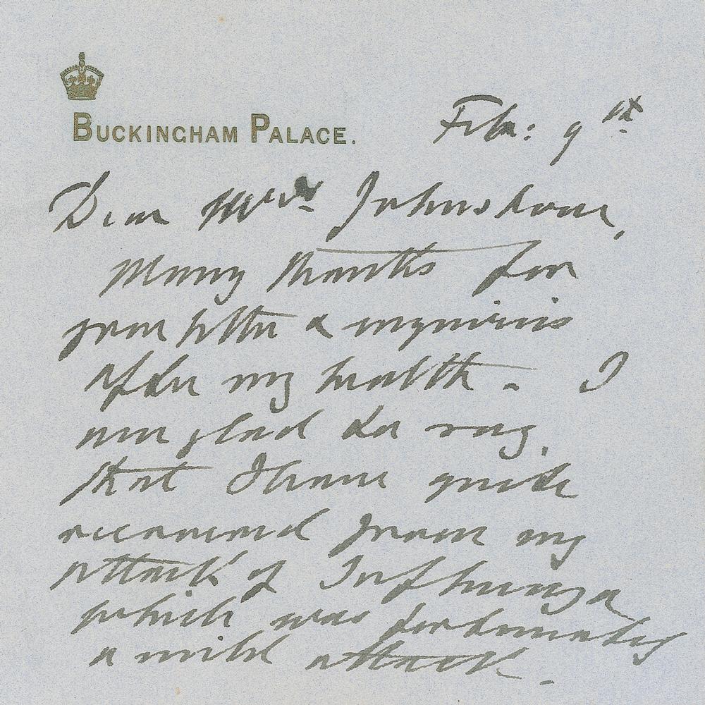 ALS signed “Edward R,” penned on both sides of a 5 x 4 Buckingham Palace card, February 9. Letter to Mrs. Johnston, in full: "Many thanks for your letter & enquiries after my health. I am glad to say that I have quite recovered from my attack of influenza which was fortunately a mild attack. I am so glad that you enjoyed your dinner at Osborne Cottage, as I know my sister is only too anxious to be civil to all those who live in the vicinity." In fine condition, with some brushing to the signature. Accompanied by the original mailing envelope.