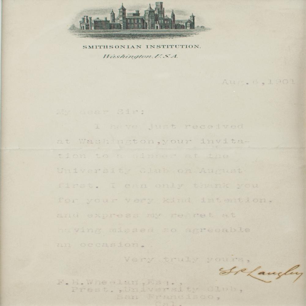 American astronomer, physicist, and aviator (1834-1906), who conducted some of the first manned flights with his Army-funded Aerodrome aircraft. TLS signed “S. P. Langley,” one page, 4 x 7, Smithsonian Institution letterhead, August 6, 1901. Letter to F. H. Wheelan, in full: "I have just received at Washington, your invitation to a dinner at the University Club on August first. I can only thank you for your very kind intention, and express my regret at having missed so agreeable an occasion." Matted and framed with a portrait and biographical clipping to an overall size of 15.5 x 13.5. In fine condition, with the typed portion of the letter faded but fully readable. From the collection of Stephen Adamson.