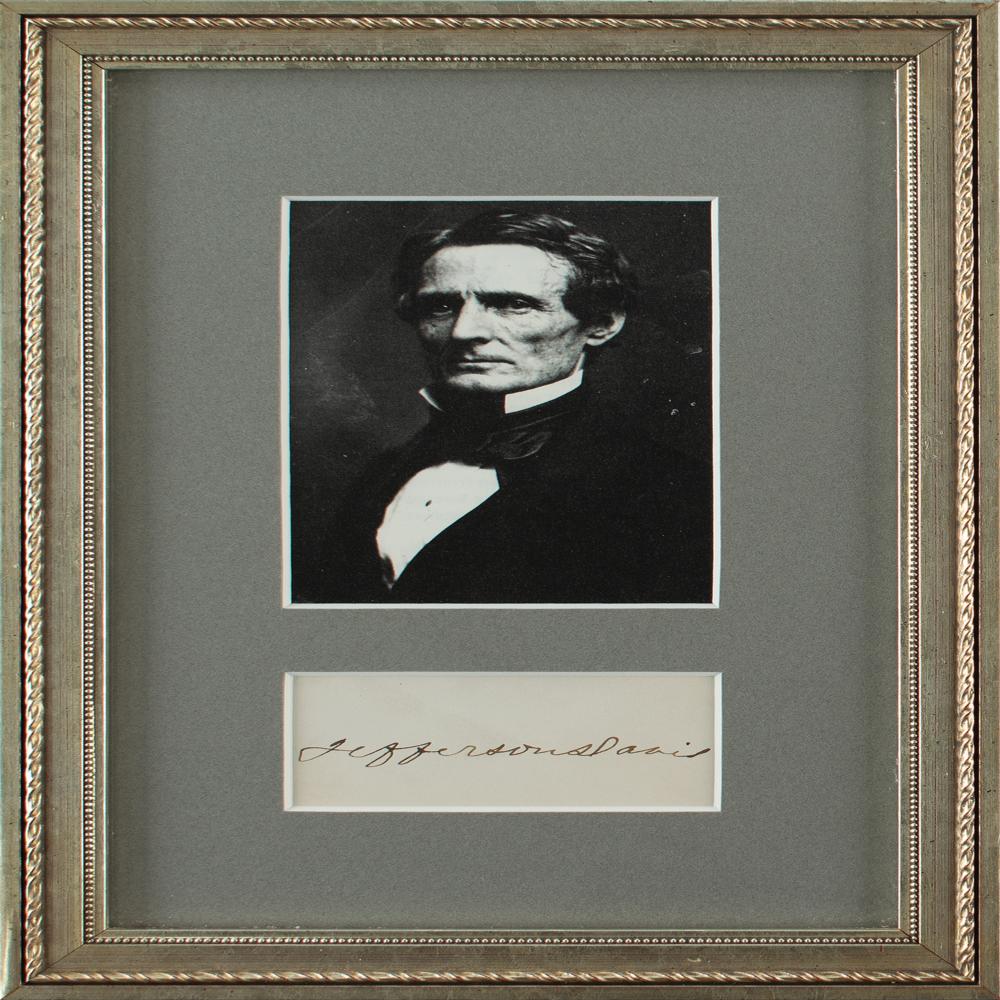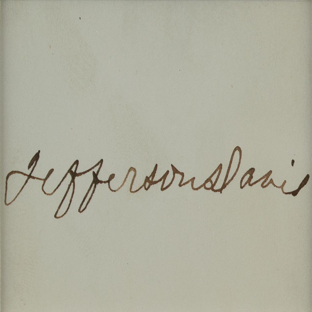 Neat ink signature, "Jefferson Davis,” on an off-white 3 x 1.5 card, matted and framed with a portrait to an overall size of 7.25 x 11. In fine condition. From the collection of Stephen Adamson.