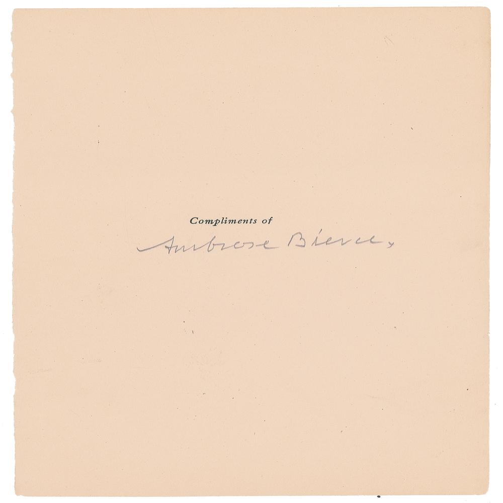 American writer (1842-c.1914) best known for his vivid short stories (including the classic 'An Occurrence at Owl Creek Bridge') and his satirical 'The Devil's Dictionary.' In 1913, while traveling with Pancho Villa's troops during the Mexican Revolution, Bierce disappeared; his ultimate fate remains a mystery. Pencil signature, "Ambrose Bierce,” on an off-white 6 x 9 sheet with "With the compliments of" pre-printed above. In very fine condition. From the collection of Stephen Adamson.