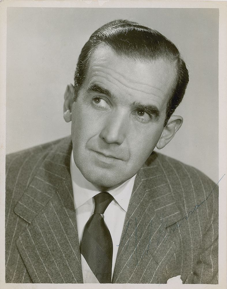 Vintage glossy 7 x 9 head-and-shoulders photo of the great newsman, signed in fountain pen, "E. R. Murrow." In fine condition, with poor signature contrast. From the collection of Stephen Adamson.