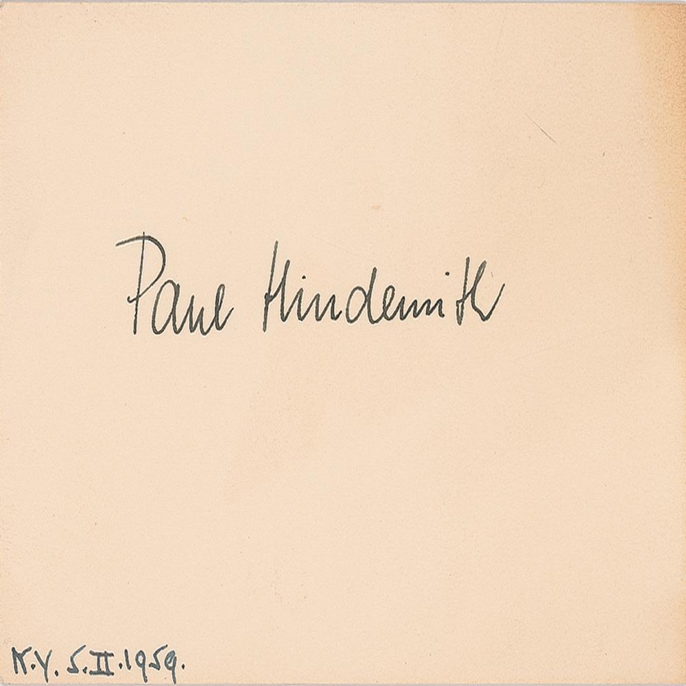 German-born composer and performer (1895-1963) whose best-known works include 'Mathis der Maler,' 'Nobilissima Visione,' and 'Das Marienleben.' Vintage fountain pen signature, "Paul Hindemith,” on an off-white 5.25 x 3.25 card dated in the lower left corner, "N.Y. 5.II.1959." In very fine condition. From the collection of Stephen Adamson.