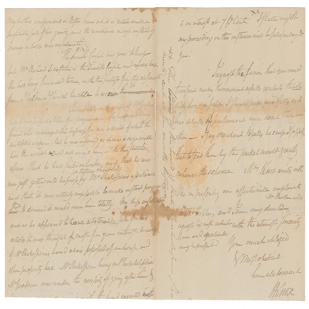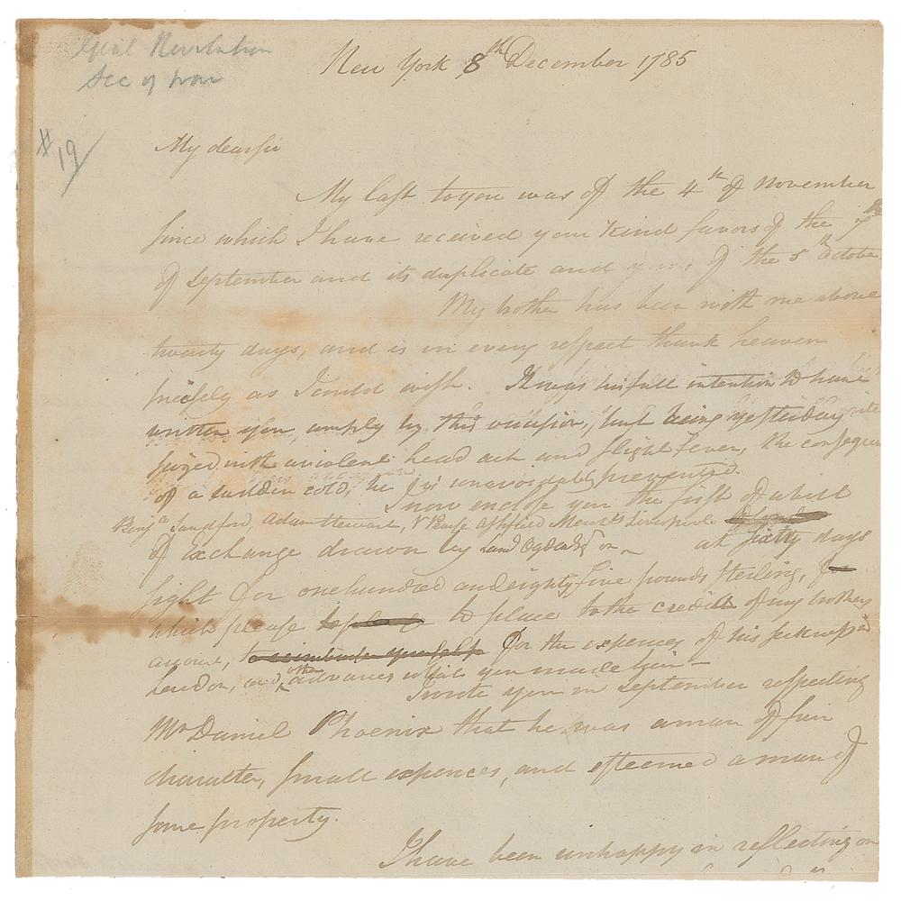 ALS signed “H. Knox,” three pages on two adjoining sheets, 7.75 x 9, December 8, 1785. Letter to James Webber, in part: "My brother has been with me about twenty days, and is in every respect thank heaven precisely as I could wish. It was his full intention to have written you, amply by this occasion, but being yesterday seized with a violent head ache and slight fever, the consequence of a sudden cold, he is unavoidably prevented?The French Consul has gone to Europe but Mr. Richard Soderstrom is the Swedish Consul and resides here. The bill being forwarded to me?I believe I should be able to recover." He goes on to discuss further business arrangements, and notes: "Mrs. Knox unites with me in presenting our affectionate compliments." In very good to fine condition, with scattered staining, trimmed bottom edge affecting some of the text, and toning and partial separation to the hinge.